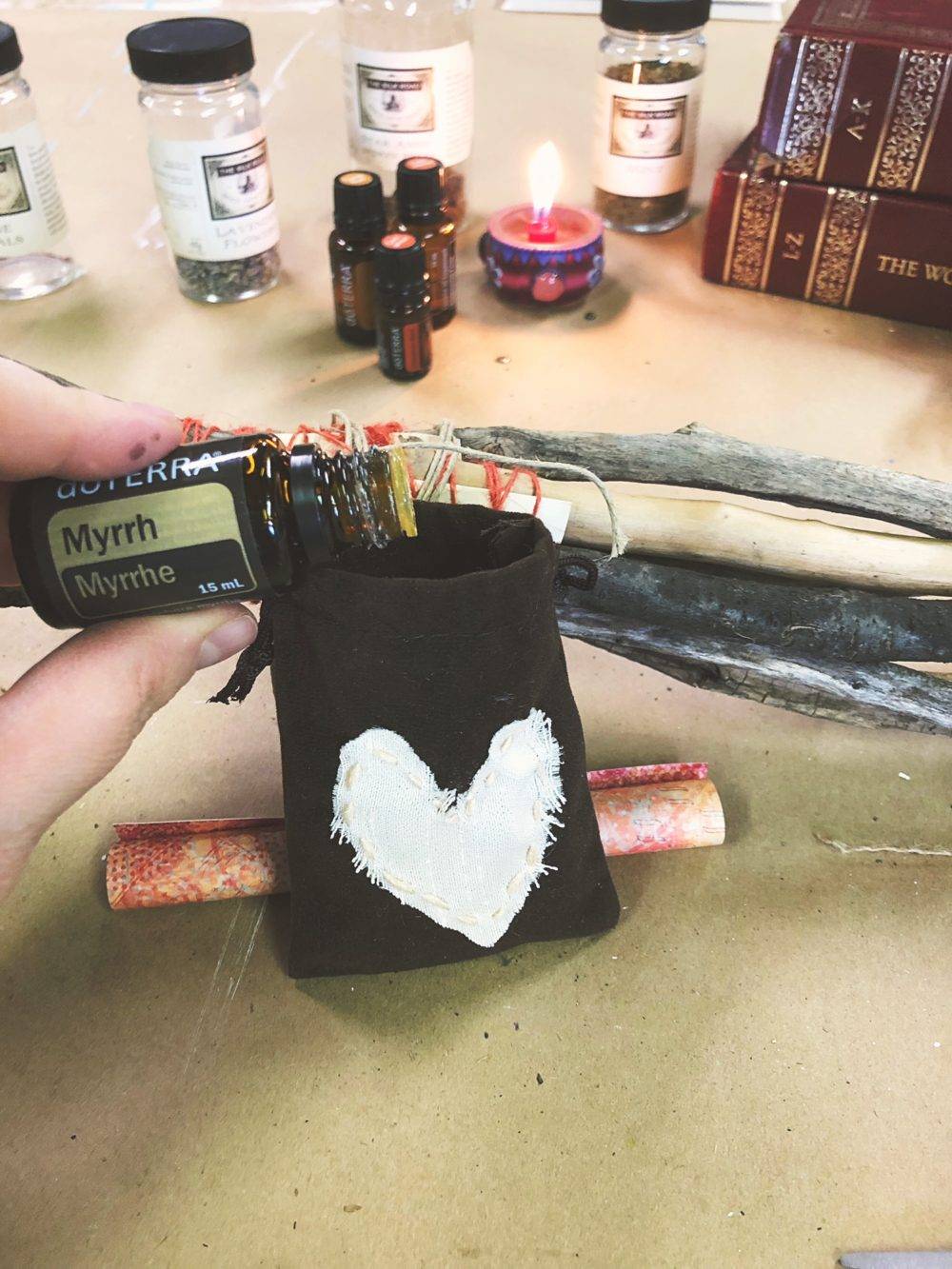 - Fill the prayer bag with plant medicine, essential oils and holy water or whatever else is meaningful to you.