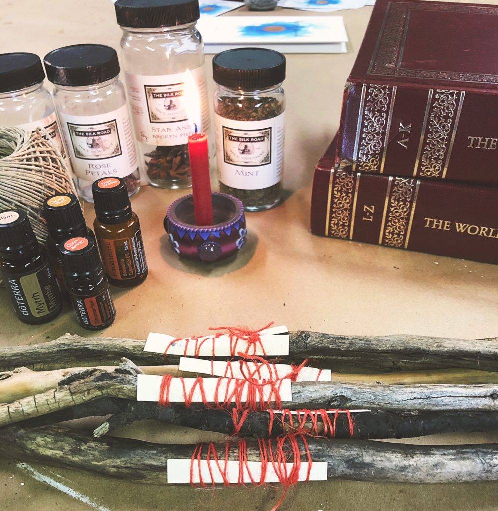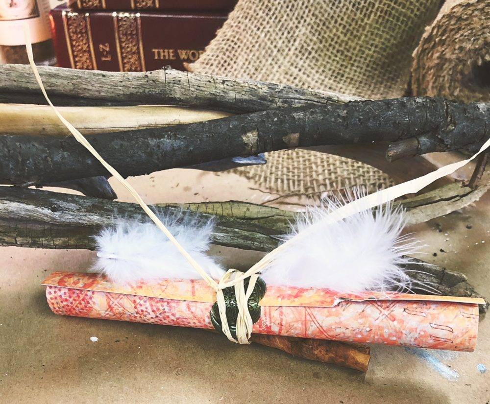 To add a little charm, I used a piece of rafia to wrap a couple cinnamon sticks and a feather to my scroll. For this step, you can use whatever objects you feel suit what you wrote about in your letter. When I was performing this ritual, I felt pulled to include lots of cinnamon. I used the cinnamon sticks here but also used Cinnamon essential oil later in my prayer bag. I was just going with my intuition so I didn’t really know why Cinnamon was drawing me so much until I read about one of the emotional properties of Cinnamon having to do with safety and security.
