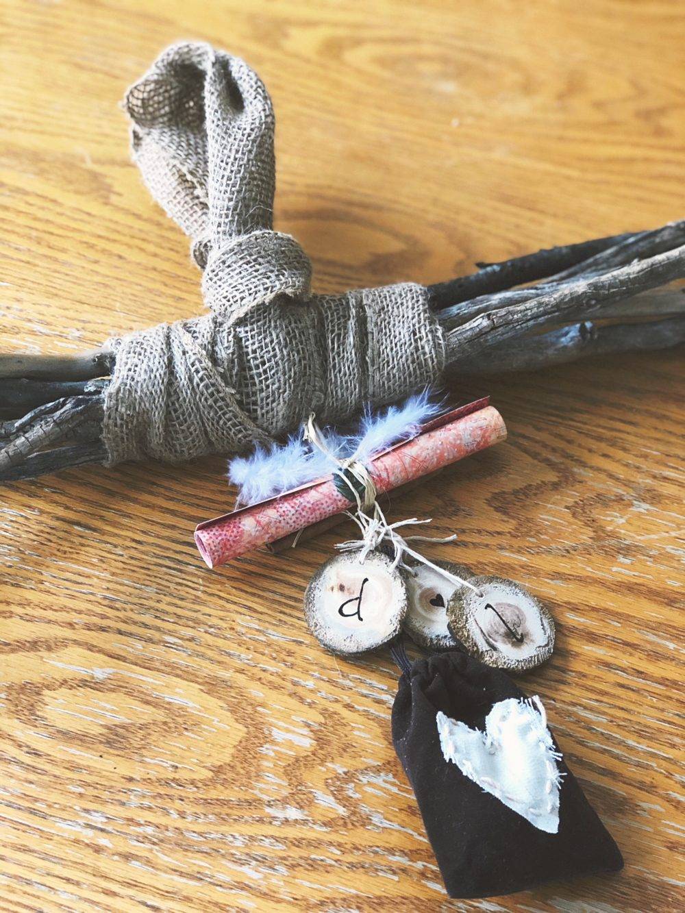 The final step was to hang the scroll, wood rounds and prayer bag to the sticks I bundled together. I used rafia string for this. Then I needed something to hang my bundle. I tied a slip knot with burlap ribbon and wrapped the ends of the slip knot around the bundle of sticks. The burlap ribbon covered up all the string and rafia pieces and finished everything off in a lovely way.