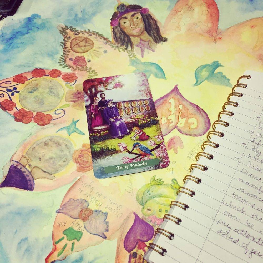 The reason I choose one tarot deck and one oracle deck is because I like to team up the thoroughness found in the tarot system with the lighter optimism I find in oracle decks. Oracle cards are usually created around one theme – love, forgiveness, animals, angels etc. – whereas the tarot system includes in-depth insight into major issues in my life and everyday concerns. I used to shy away from tarot decks because I was afraid of what I judged to be their darker messages but that was naive of me. Tarot provides complex answers that reveal the challenges, celebrations, hidden desires, obstacles and ego side of life and my personality. Tarot doesn’t pretend life is all chocolate and glass slippers. Life throws shit at me all the time. Pretending everything will be perfect is ridiculous and unrealistic. Personally, to support me through my difficult times, I’d rather have a head’s up on what challenges might be coming than be caught by surprise.