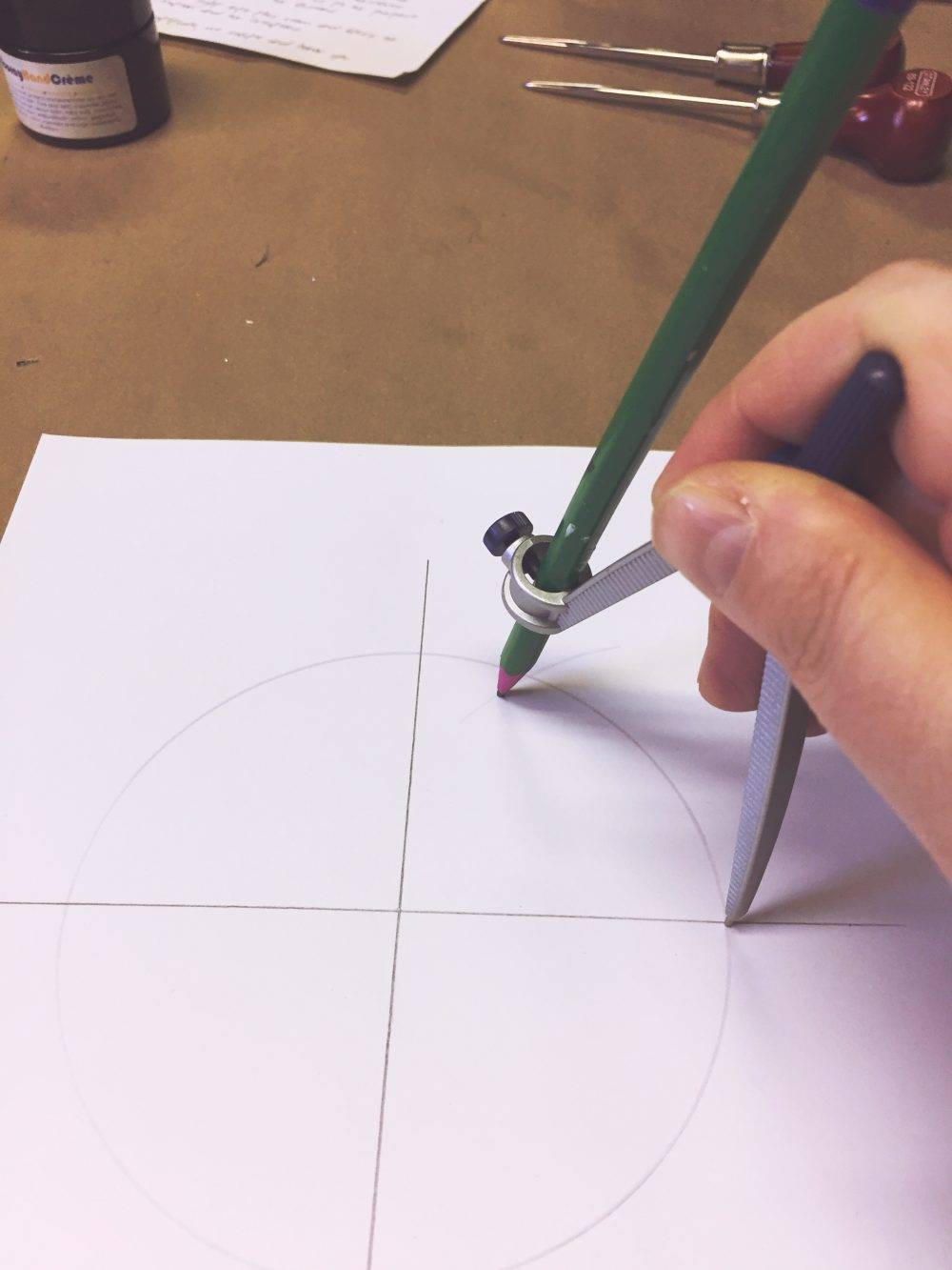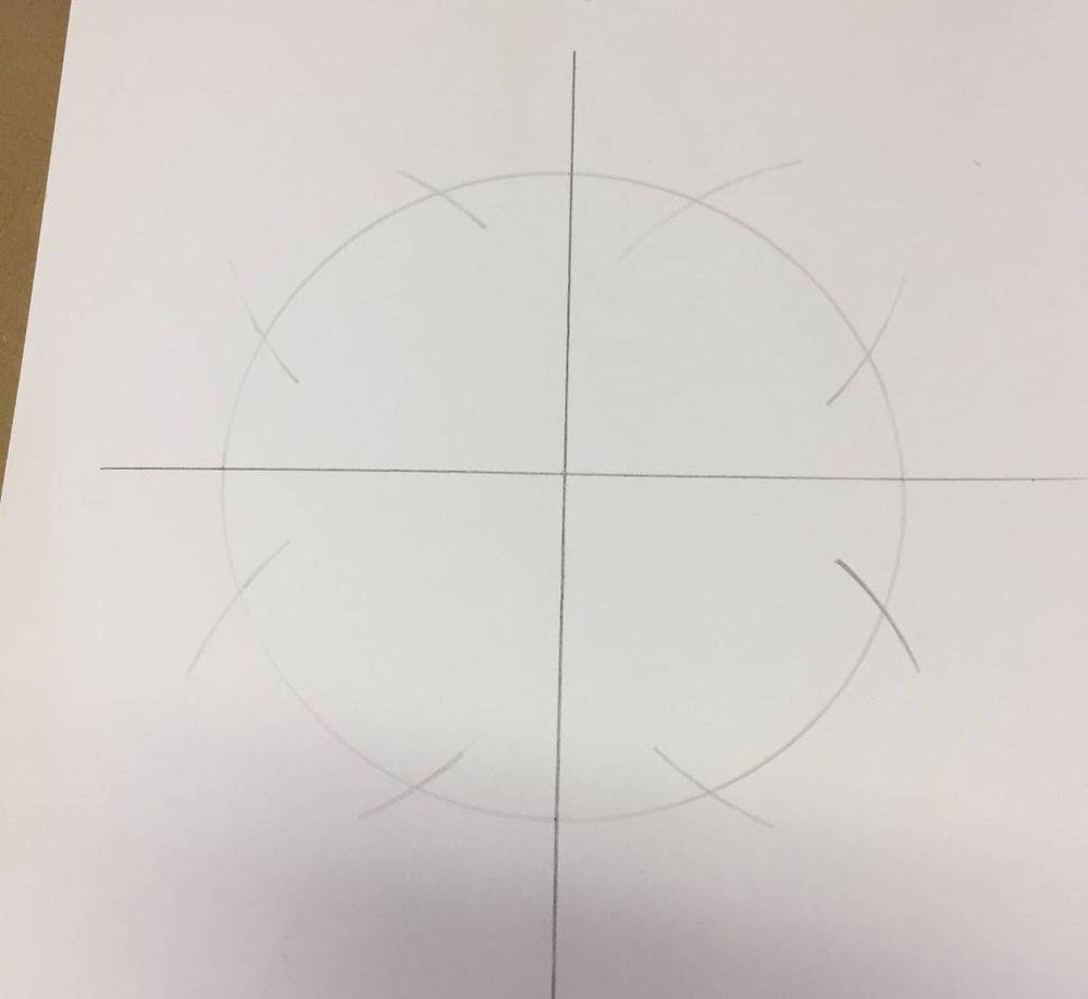 Then, without changing the distance of my compass, I placed the point of the compass on each outside point of the cross and made a mark on both sides of the line.