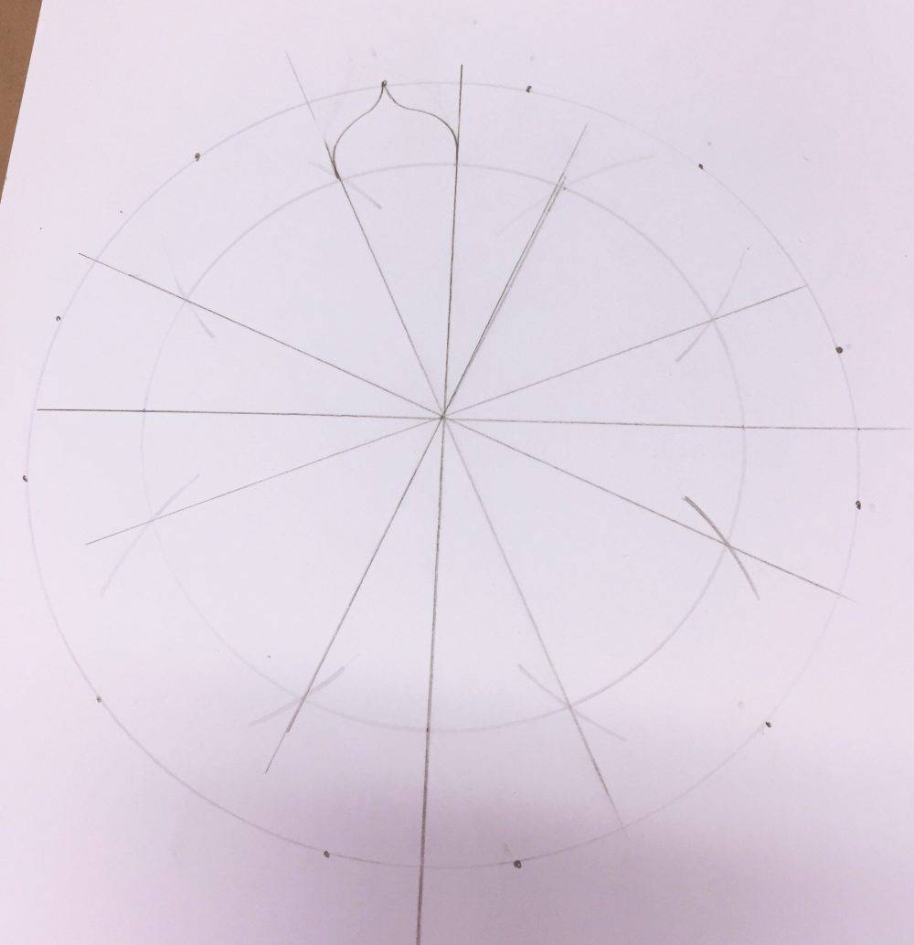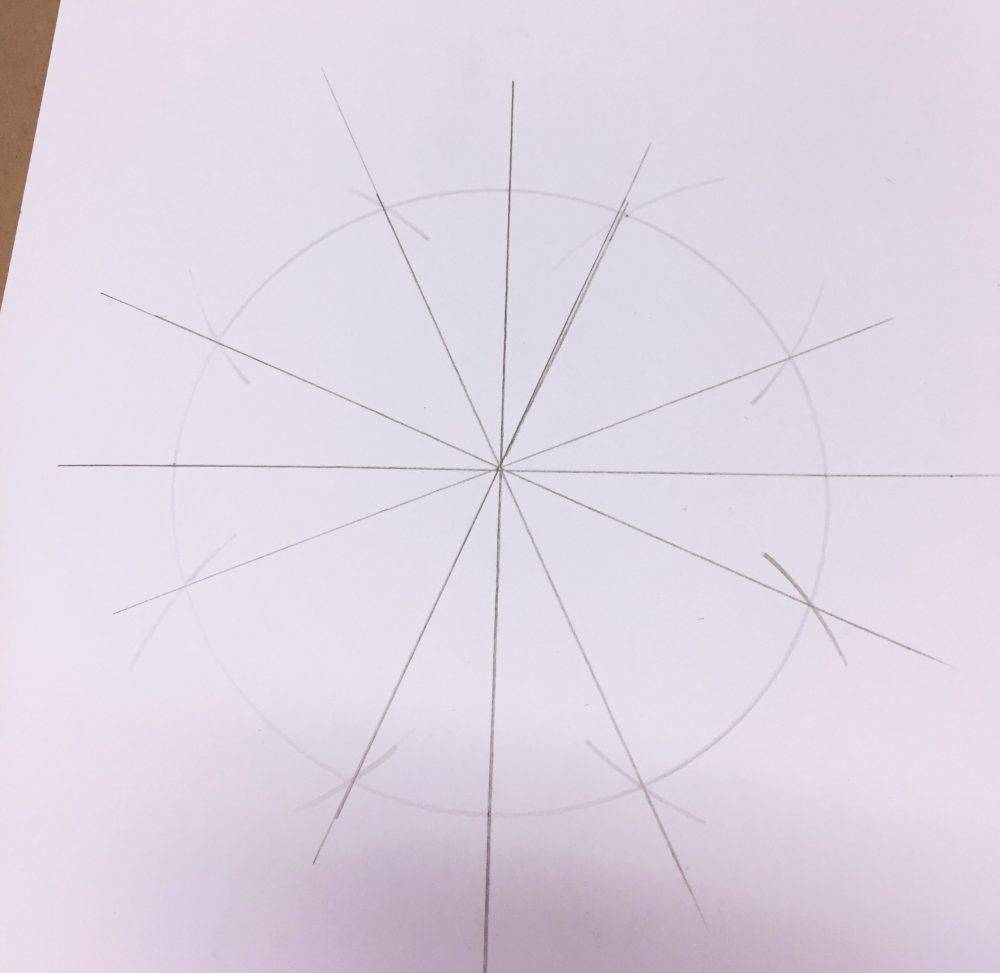 All I had to do was place my ruler from one outside point across the center point and over to meet the opposing outside point on the other end of the circle and draw a line. This created 12 sections. The sections pictured here aren’t equal because I made the mistake of forgetting to measure my cross properly but I’m not a stickler for details so I just went with it regardless of the mistake.