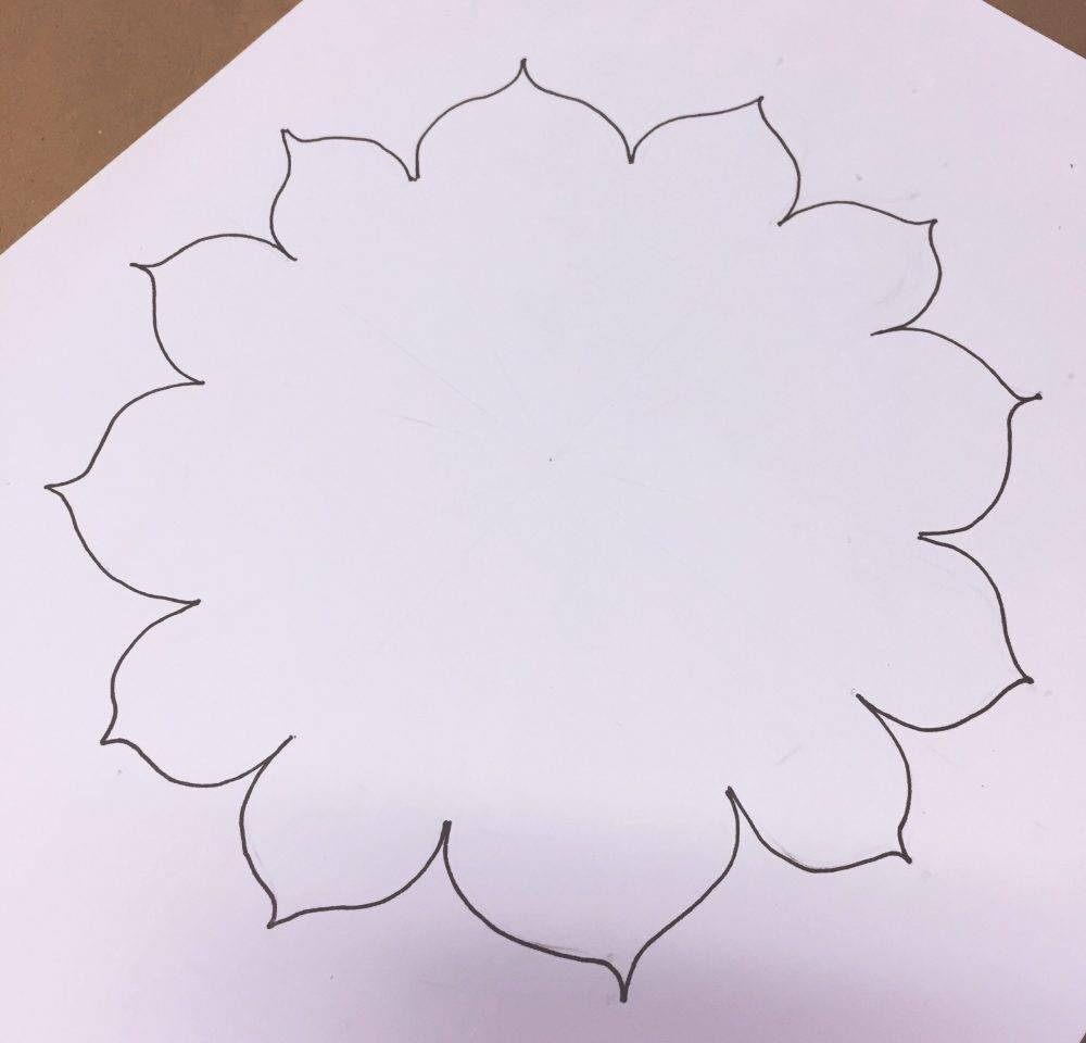 To create a sun mandala I cut an 18″ x 18″ piece of heavy watercolor paper and drew a circle in the middle of it and divided the circle into 12 equal sections. At the top of each section, I drew a petal shape then erased all the lines so only the outline was visible.