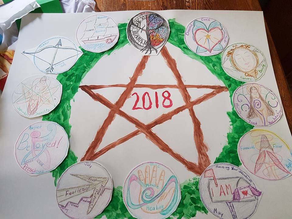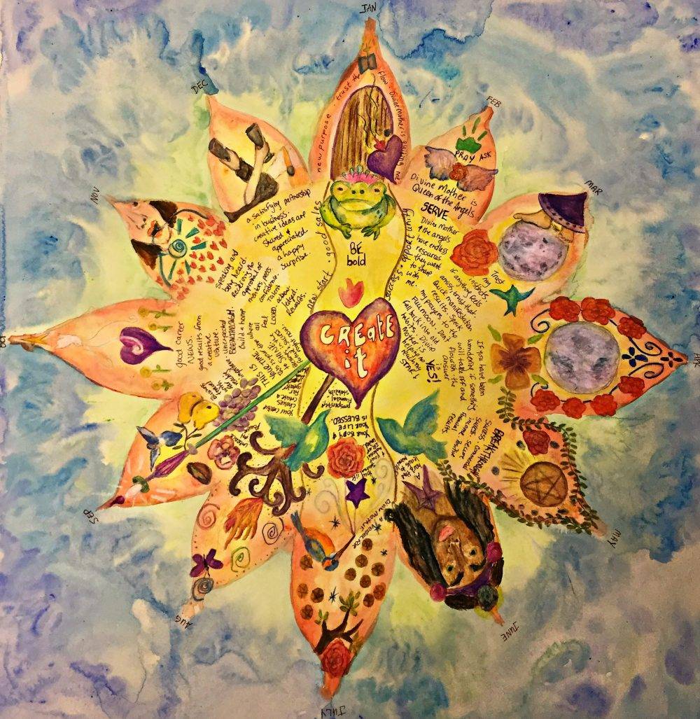 Another way I prepare my highly sensitive system for what might lie ahead is by creating a Mandala Forecast. It’s my creative way to collect signs and messages from Spirit about the year ahead. I start with choosing one Tarot deck and one Oracle deck. This year I chose “The Green Witch Tarot” by Ann Moura and Kiri Østergaard Leonard and “The Mother Mary Oracle” by Alana Fairchild and Shiloh Sophia McCloud.