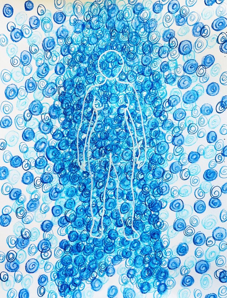 5. Inside the body outline, start drawing counterclockwise spirals. Begin from the feet and move upwards or begin from the head and move downwards – whatever feels right for you. As you draw, focus on the intention of releasing any negative or stagnant energies from your body. Each spiral is a symbol of unwinding and releasing energy.