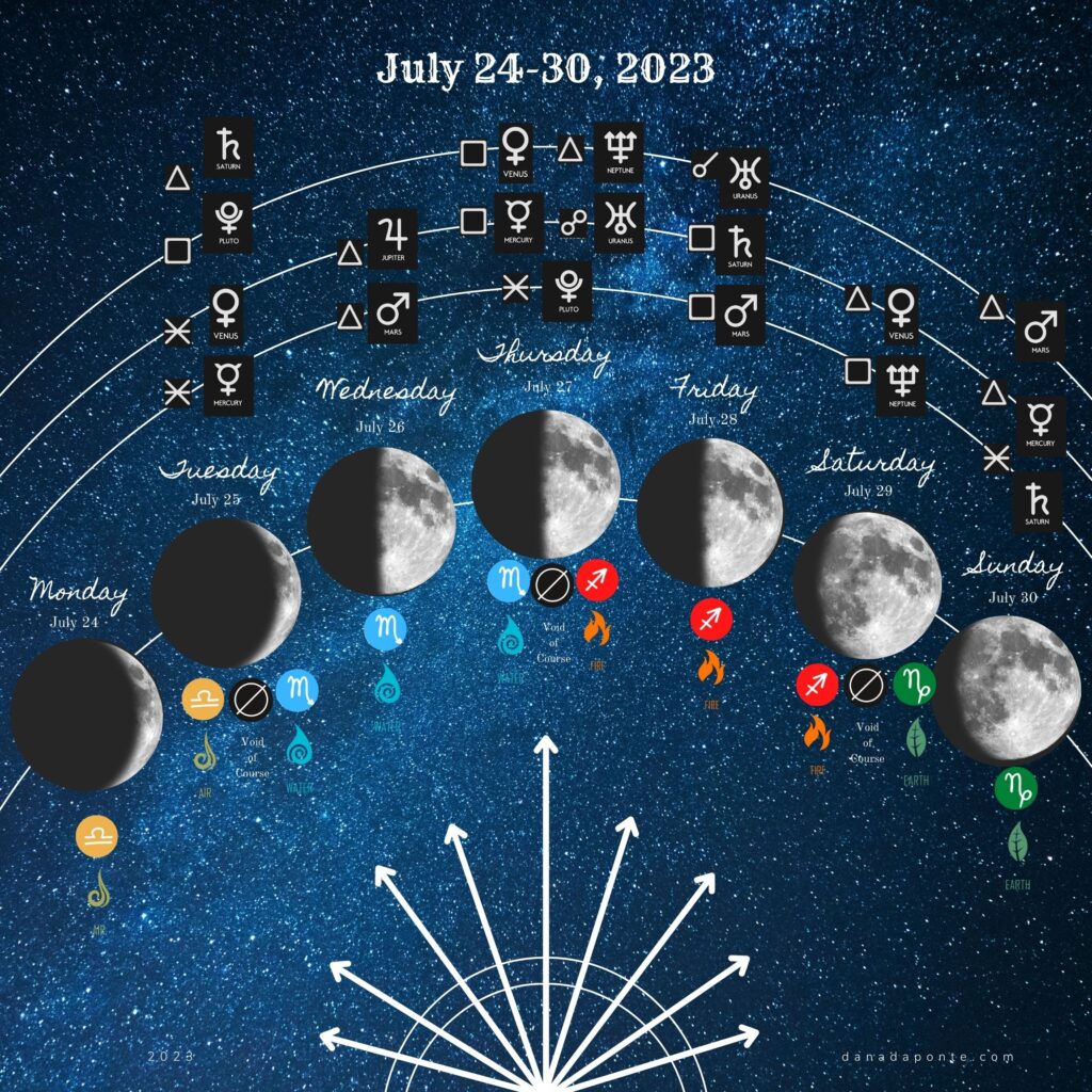 Every week the emotional and magical opportunities the moon is sending you are different because the energy she is drawing down from the planets and stars changes moment to moment. Planets and stars and moon phases and moon signs each carry their own unique energy. This is my weekly update of the moon’s comings and goings to support you in aligning with her energy.