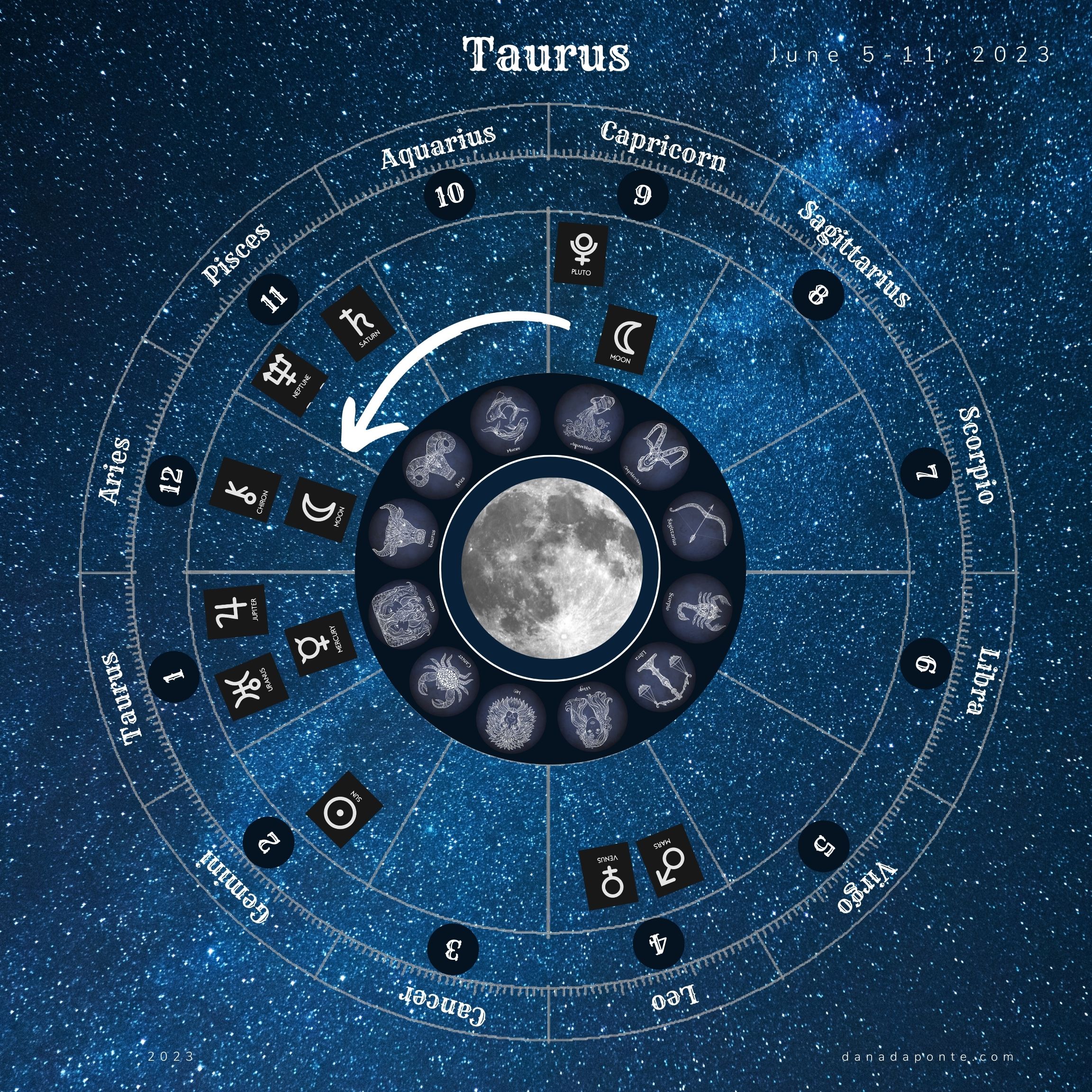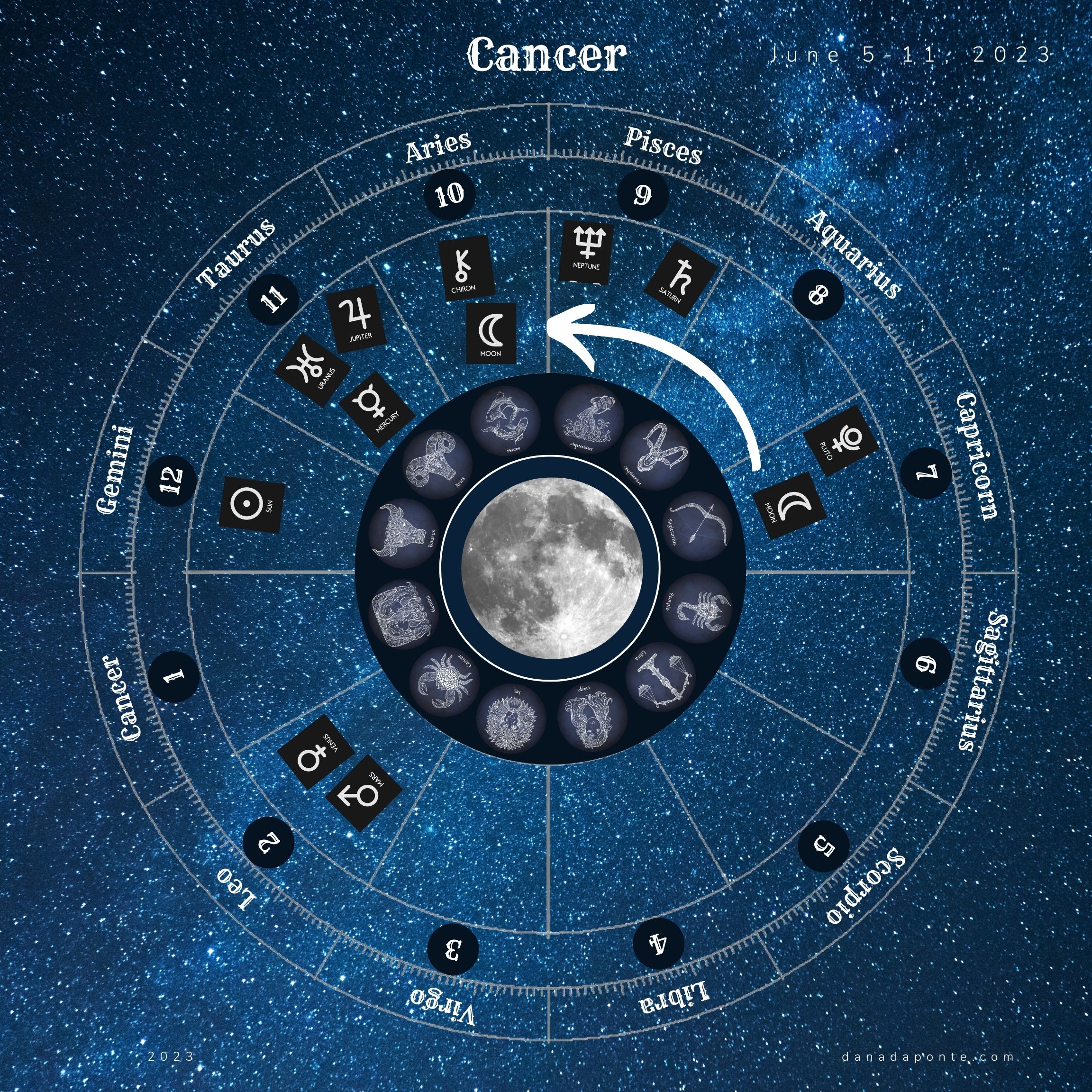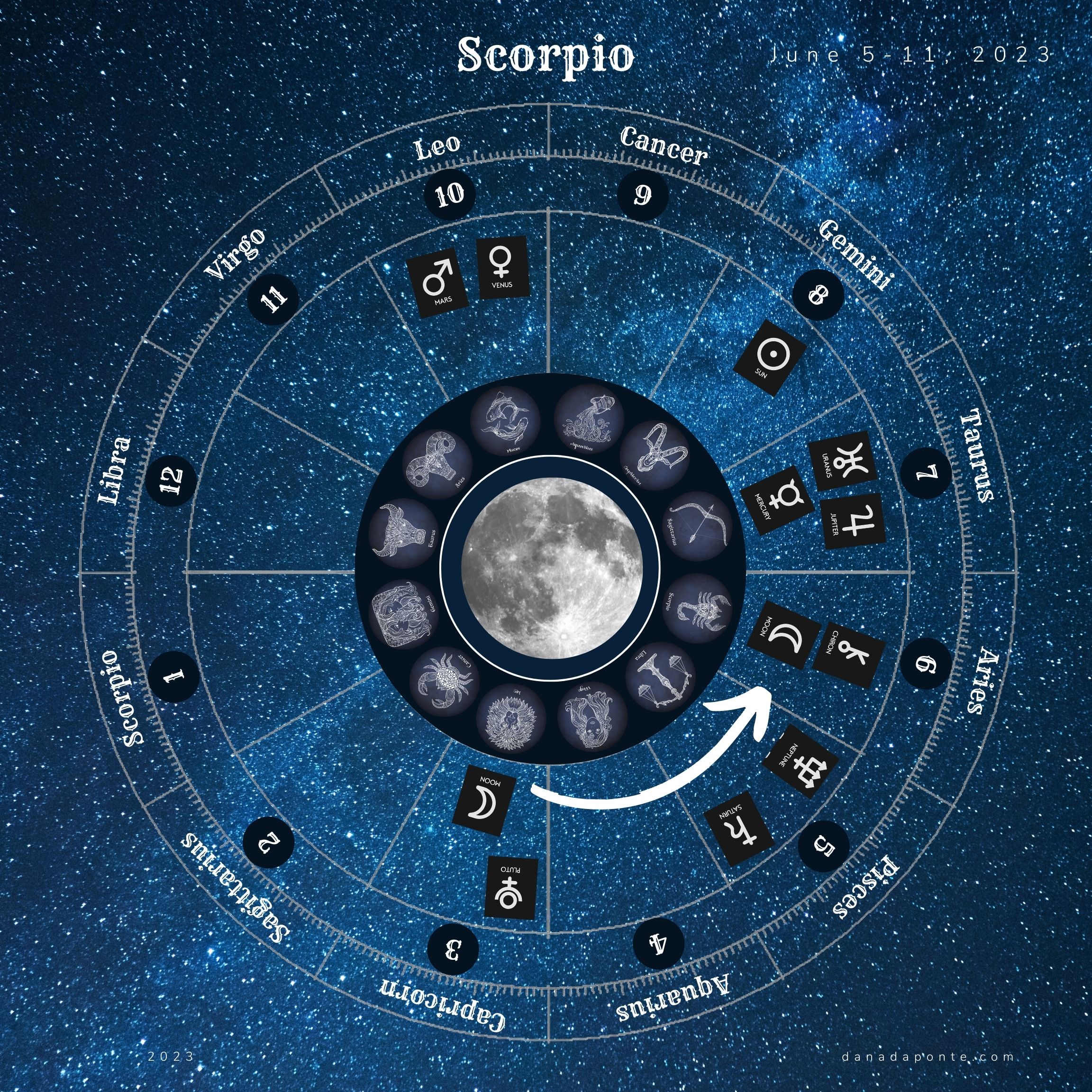 Scroll down to the images that show you the moon this week according to your rising sign again. Find the image with your rising sign then look at the zodiac wheel and find the pie shaped part of the chart that is titled “Gemini”. Next, look at the number below the word “Gemini”. That number represents the astrological house that Gemini takes care of on your birth chart. What astrological house number did you see?