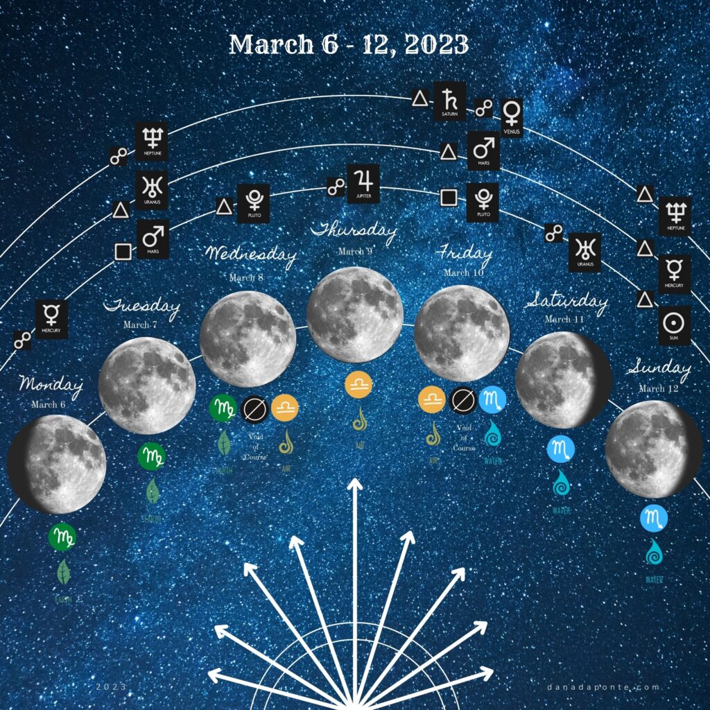Every week the emotional and magical opportunities the moon is sending you are different because the energy she is drawing down from the planets and stars changes moment to moment. Planets and stars and moon phases and moon signs each carry their own unique energy .This is my weekly update (Mon-Fri) of the moon’s comings and goings to support you in aligning with her energy.