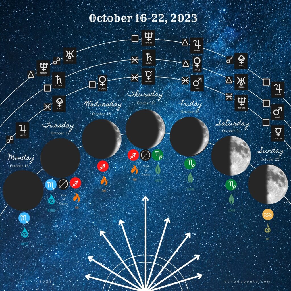 Every week the emotional and magical opportunities the moon is sending you are different because the energy she is drawing down from the planets and stars changes moment to moment. Planets and stars and moon phases and moon signs each carry their own unique energy. This is my weekly update of the moon’s comings and goings to support you in aligning with her energy.