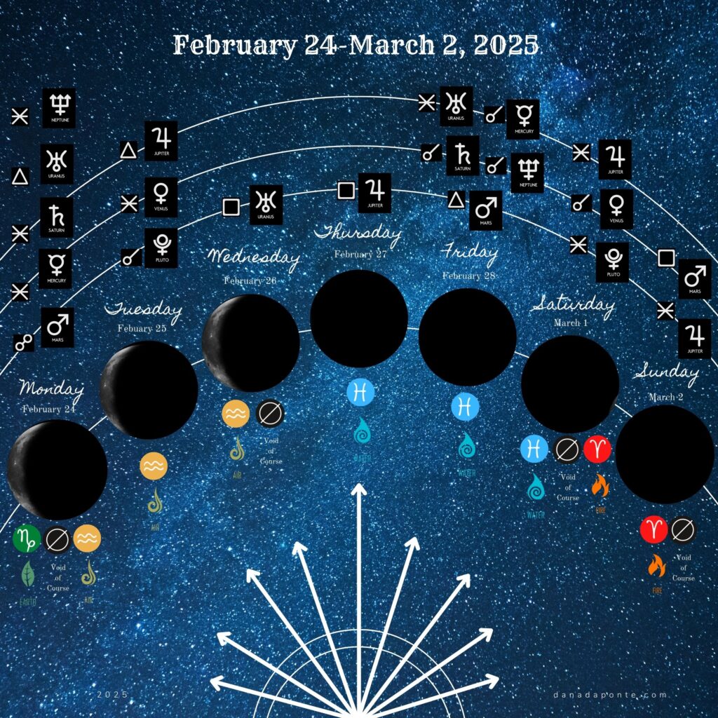 In this post, I share a summary of the moon for the week of February 24-March 2, 2025 as it moves through the zodiac and interacts with the planets. I also invite you to work with Pisces new moon to plant seeds of intention for your next big adventure.