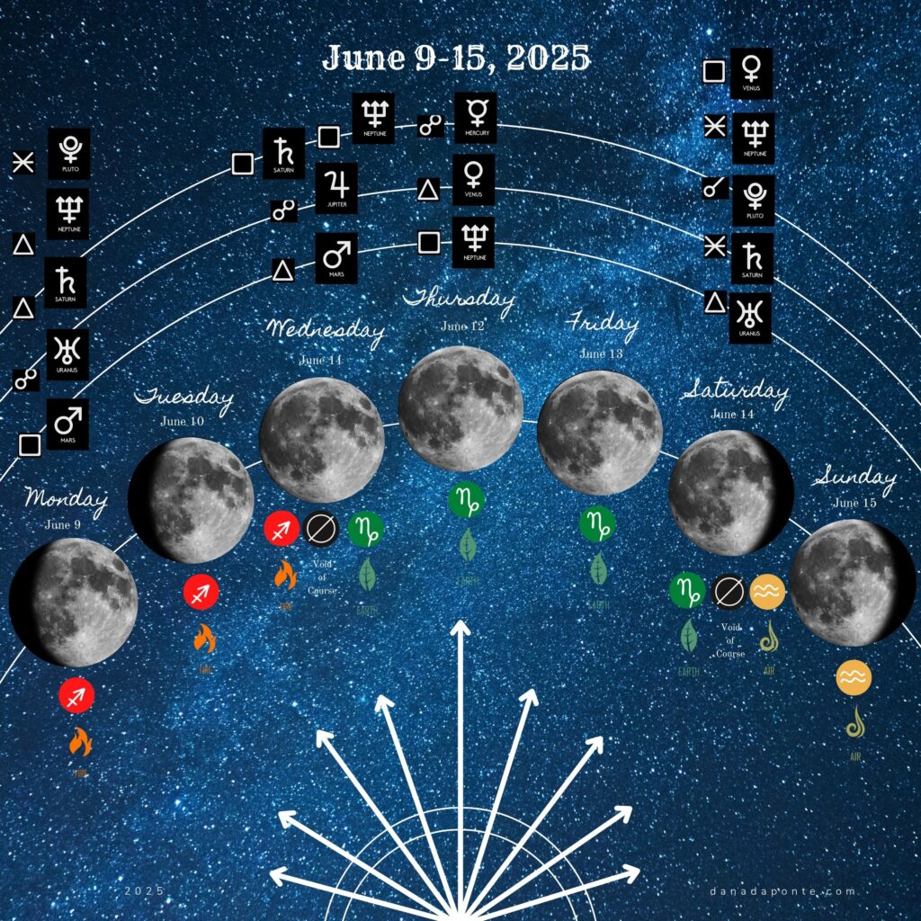 In this post, I share a summary of the moon for the week of June 9-15, 2025 as it moves through the zodiac and interacts with the planets. I also talk about working with the magic of the Sagittarius full moon to amplify your dreams.