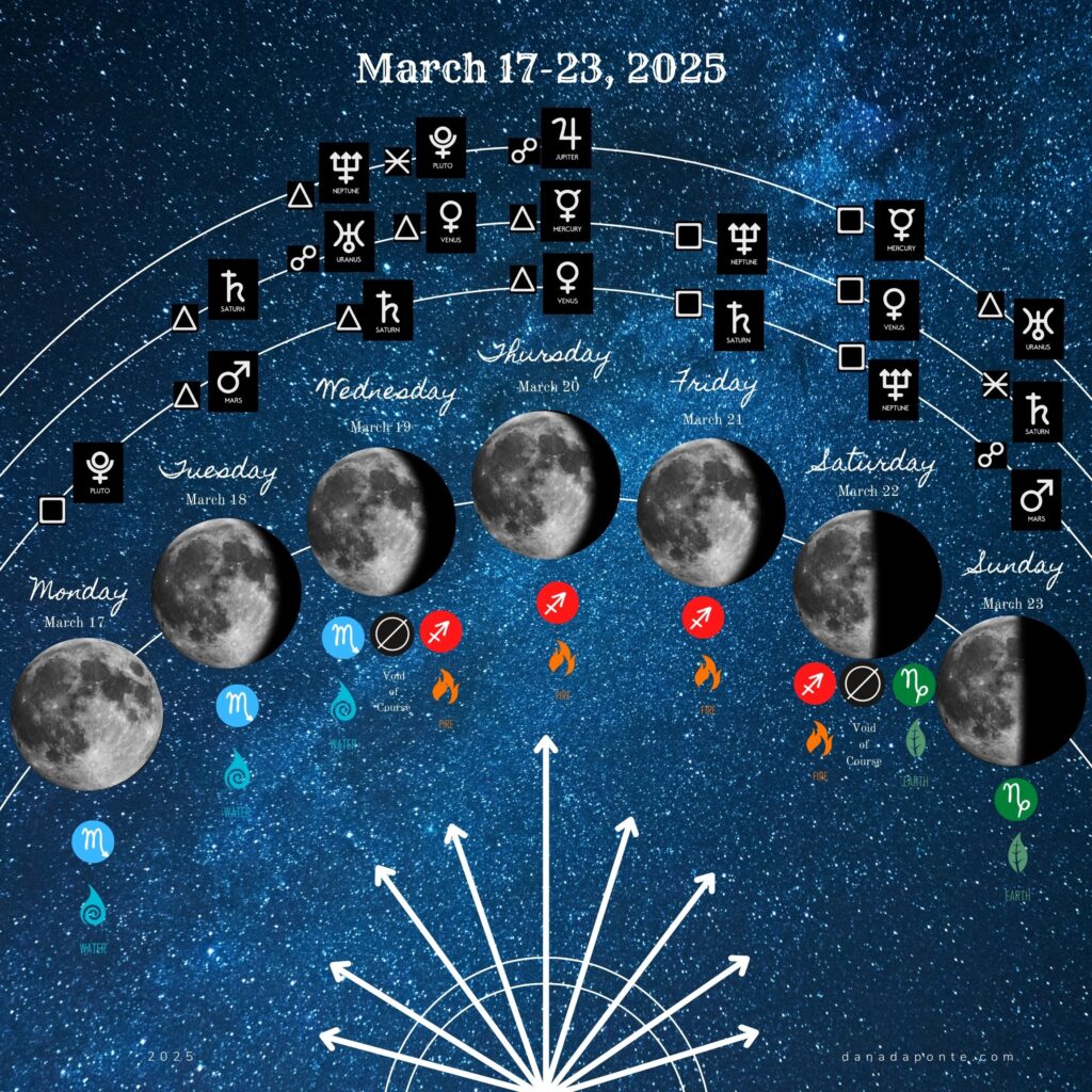 In this post, I share a summary of the moon for the week of March 17-23, 2025 as it moves through the zodiac and interacts with the planets. I also talk about making an altar to the sun in your art journal for the spring equinox.