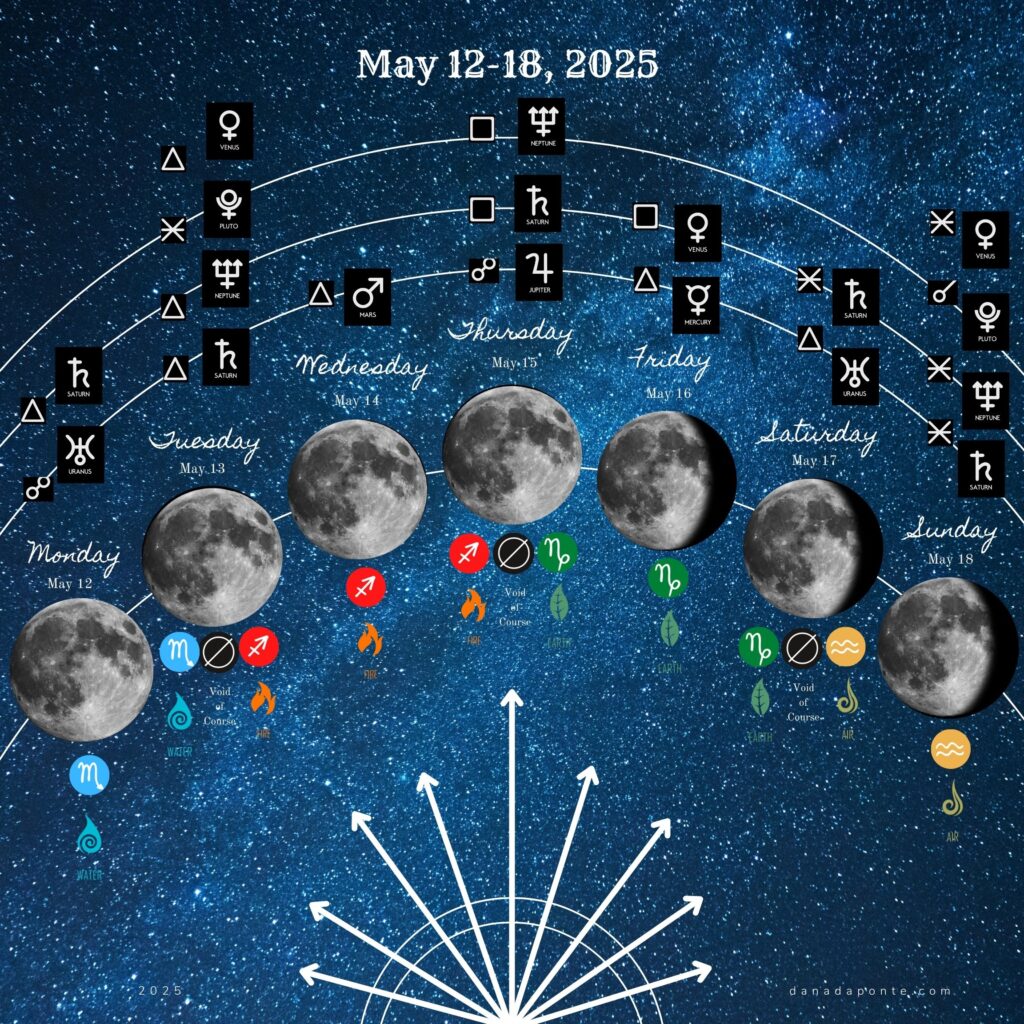 In this post, I share a summary of the moon for the week of May 12-18, 2025 as it moves through the zodiac and interacts with the planets. I also talk about shedding emotional weight in your art journal with the full moon in Scorpio.