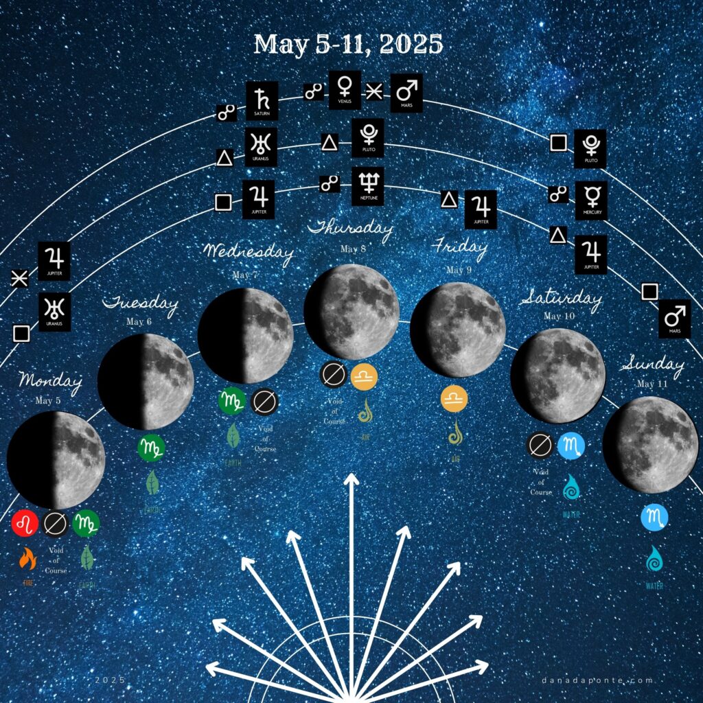 In this post, I share a summary of the moon for the week of May 5-11, 2025 as it moves through the zodiac and interacts with the planets. I also talk about the way the moon and stars are helping us this week to change and grow to fit the new beginnings that want to happen in our lives.