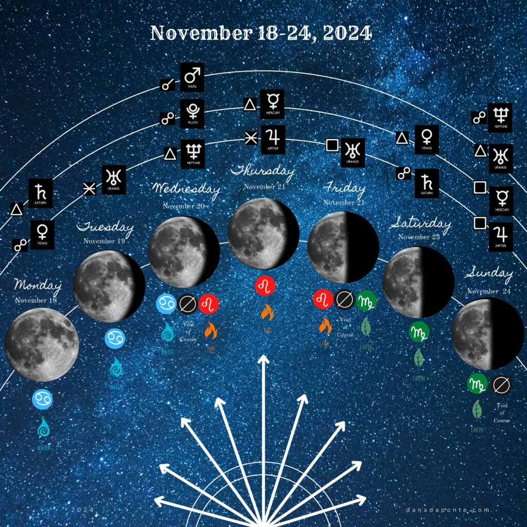 In this post, I share a summary of the moon for the week of November 18-24, 2024 as it moves through the zodiac and interacts with the planets.
