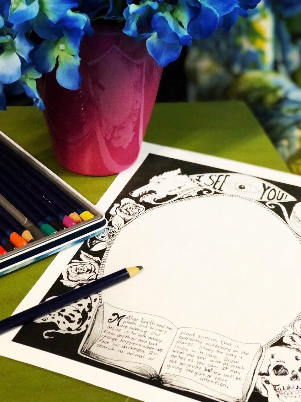 To complete the activity, research and find an environment or species that is struggling to survive in or around the area you live. Learn about humanity’s role in that species’ struggle to survive. If you can, visit a relevant location in nature and try to feel in your heart what the surroundings are experiencing. Print the page I’ve included below and draw what you feel.