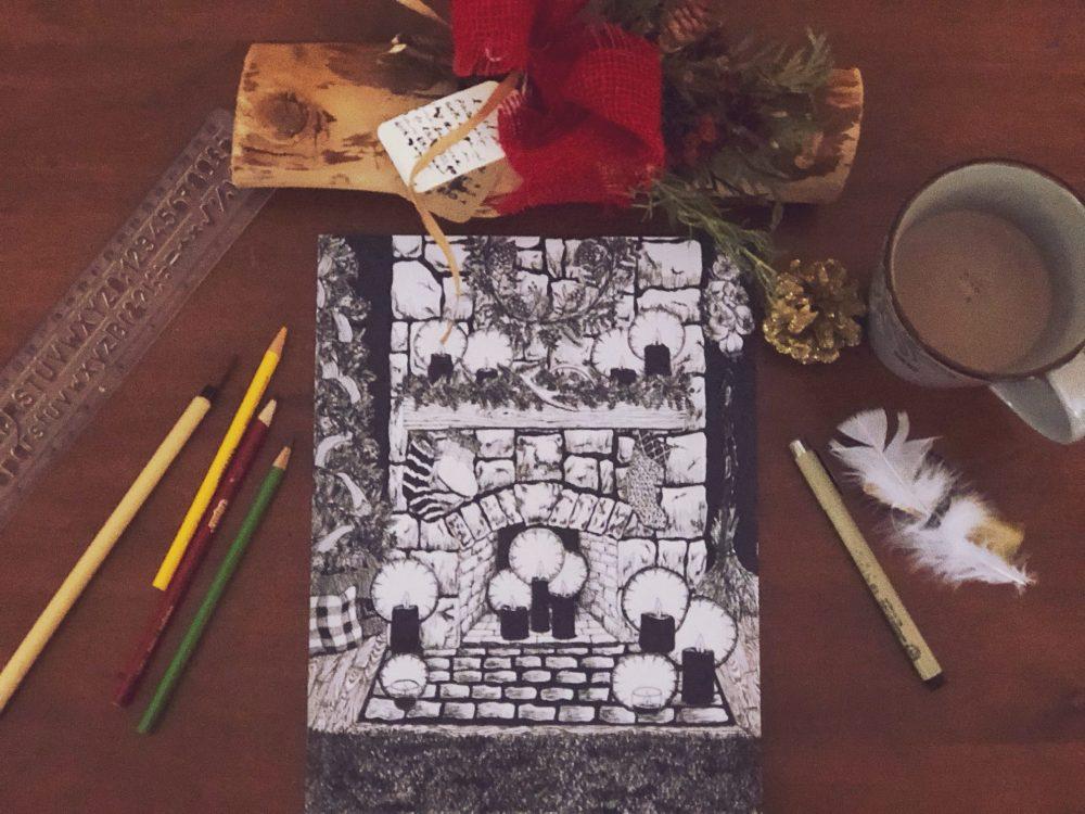 The focal point on the page is the hearth. There was a time when the hearth was the center of the home. It provided light and warmth and a gathering space for friends and family. It is where the element of fire lived in the home. Fire symbolizes the Divine light we carry in our hearts and souls along with the spiritual light we carry into our every day lives. Fire is also a strong purifier. It burns and transforms but instead of showing a raging fire, this page uses the softer, more gentle flames that dance upon the candle wicks that sit around the hearth and along the mantle. These smaller flames represent a slower, more mindful release.