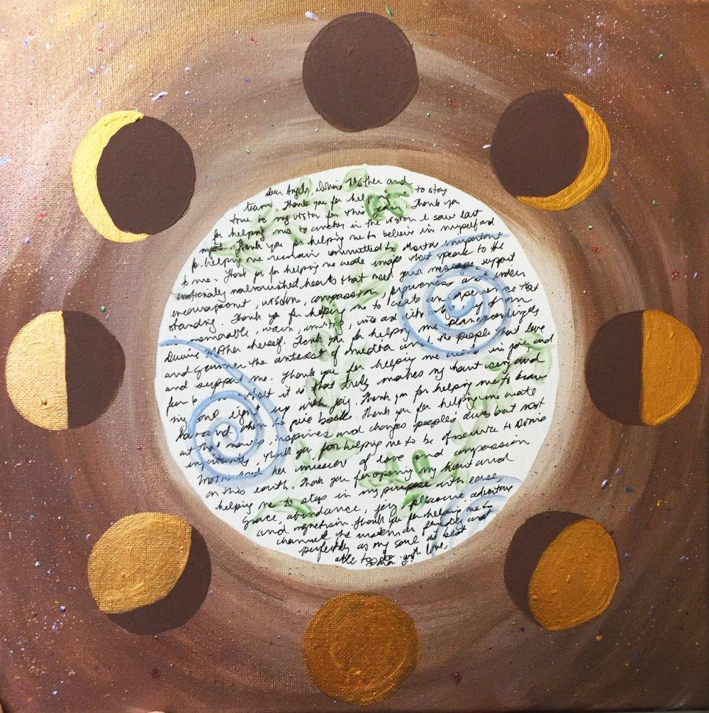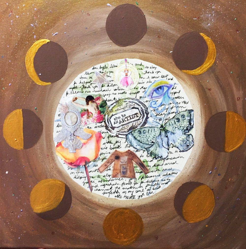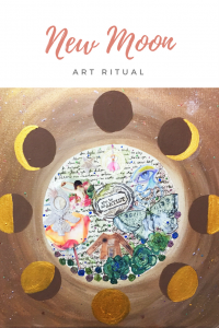 During the New Moon, I like to perform art rituals around manifesting, getting clear on what it is I really want, looking forward, planning and thinking about what I want the next Moon Cycle to look like. This particular art ritual includes a visual representation of the moon phases painted around a mandala collage. The collage is similar to a mini vision board but I add a couple steps I think are helpful and add visual interest to the piece. What I like about the moon phases circling the collage is the way the painted circles show the moon grow full then retreat back into darkness. This reminds me of the tides of creation – that ebb and flow movement of stillness, inspiration and action.
