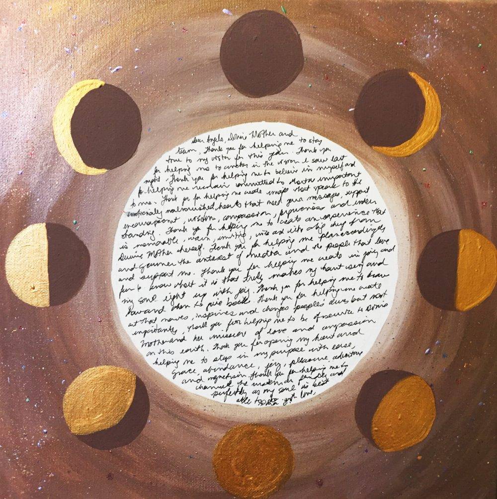 When performing a new moon ritual, there are a few steps I perform before I sit down to paint. They include gathering my materials, clearing my mind and my physical space, inviting or calling in my spiritual helpers and setting boundaries or placing a circle of protection. I outline these steps in more detail in my Moon Sisters Art and Ritual Magazine. You can subscribe to the magazine on my home page if you like and you’ll receive a collection of magazine samples that includes my “Beginner’s Guide to Preparing for Art Rituals”.
