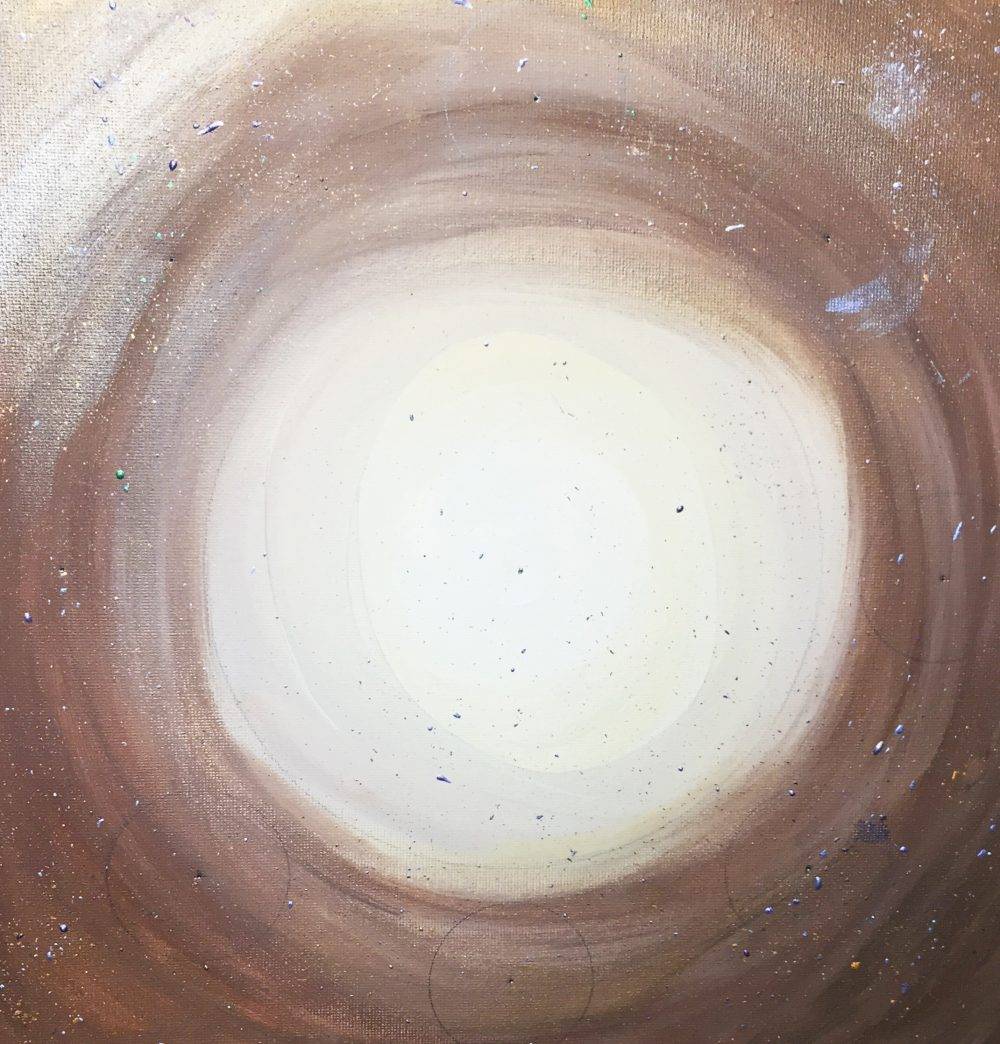 After I completed my preparations for this new moon ritual, I chose three tones of a similar color. I put a dot of the lightest tone of paint in the middle of my canvas and swirled it around in a circle. In this particular piece, I used a light beige as my lightest tone then a tan color and finally a dark brown mixed with a bit of espresso metallic paint. I kept swirling my colors in circles blending the edges somewhat together until I liked the finished effect. Then I painted the sides of the canvas with my dark tone of brown because I like to finish the edges of my canvas instead of worrying about framing them. I was going for a galaxy looking background but instead of blues and purples I decided to paint a brown galaxy. I’m not sure why. I don’t particularly like brown but it was fun to try something different.