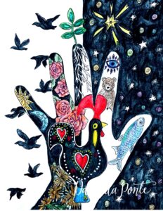 I placed an image of the Portuguese rooster because it’s a symbol of good luck. There are roots growing from my finger and a plant stretching into the cosmos which reminds me of expansion and growth – qualities I want to create more of to help me reach my goal. The dandelions symbolize my childhood and the challenging parts of it I’ve learned to face and embrace. The bear and the eye symbolize my ability to see into unseen realms and the power of working with my subconscious mind. The roses represent my devotion to the Great Mother. The geese flying in the background symbolize how I want my creations to reach far off places – like how Canadian geese find homes in both the northern countries and the southern ones. I drew the fish there because one of the ways I’ll know I reached my money goal is when I can buy my husband a fishing boat (shh. Don’t tell him.)