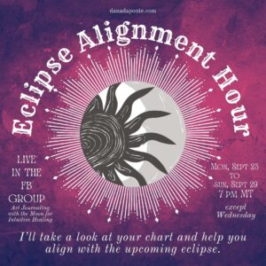 Every day this week – Monday – Sunday, at 7 pm MT, except for Wednesday when I’ll be leading the Witchy Wednesday Art Circle, you can find me live in the Facebook group Art Journal with the Moon for Intuitive Healing. I’ll be there to help anyone interested in going over their birth charts and offer my perspective on how to align with the powerful eclipse energy we’re experiencing. This is a unique opportunity to release and shed old versions of yourself so you can better align with the dreams and goals you have for the areas of your life that the eclipse energy is highlighting according to your birth chart.