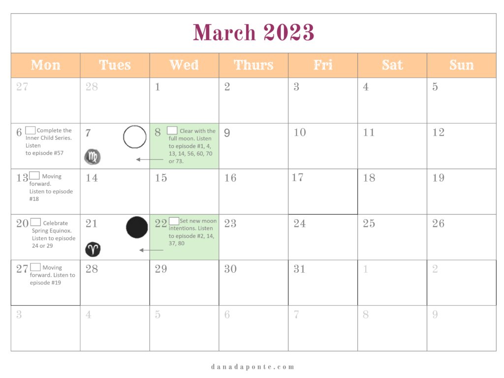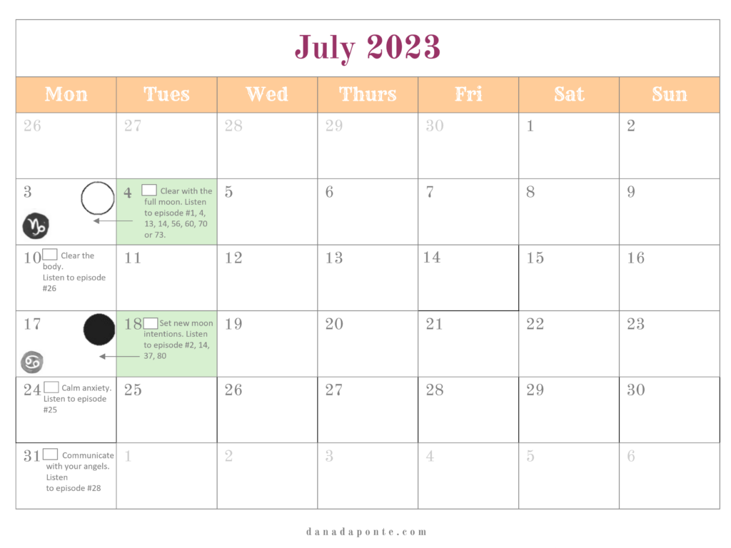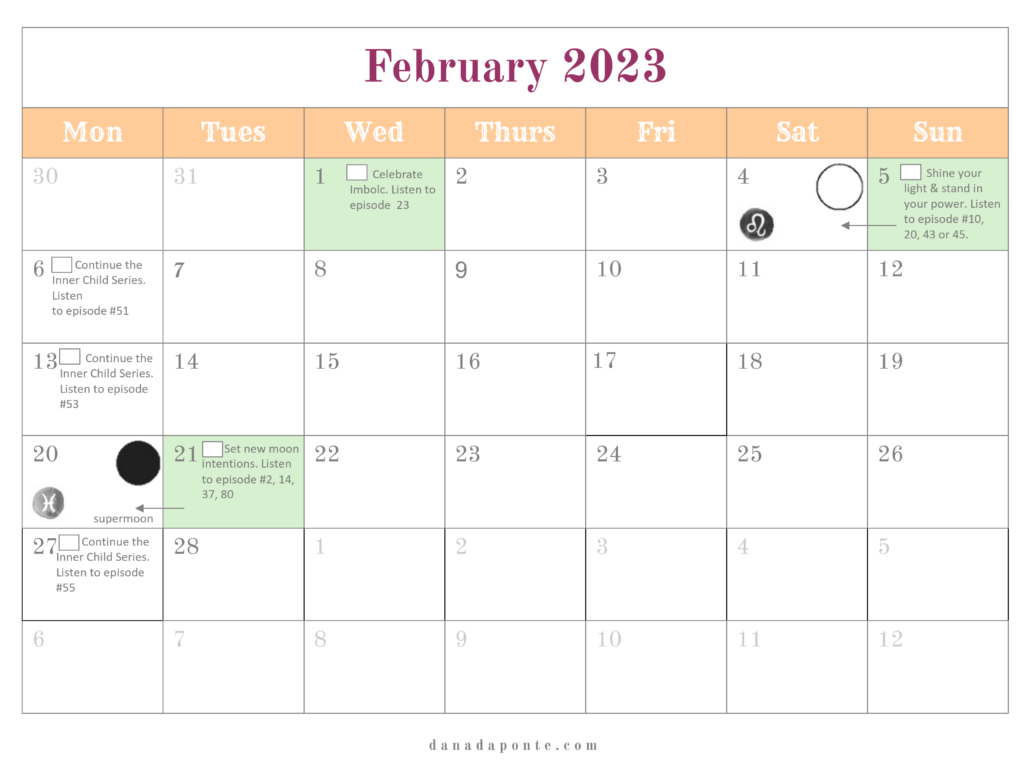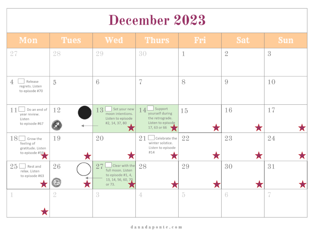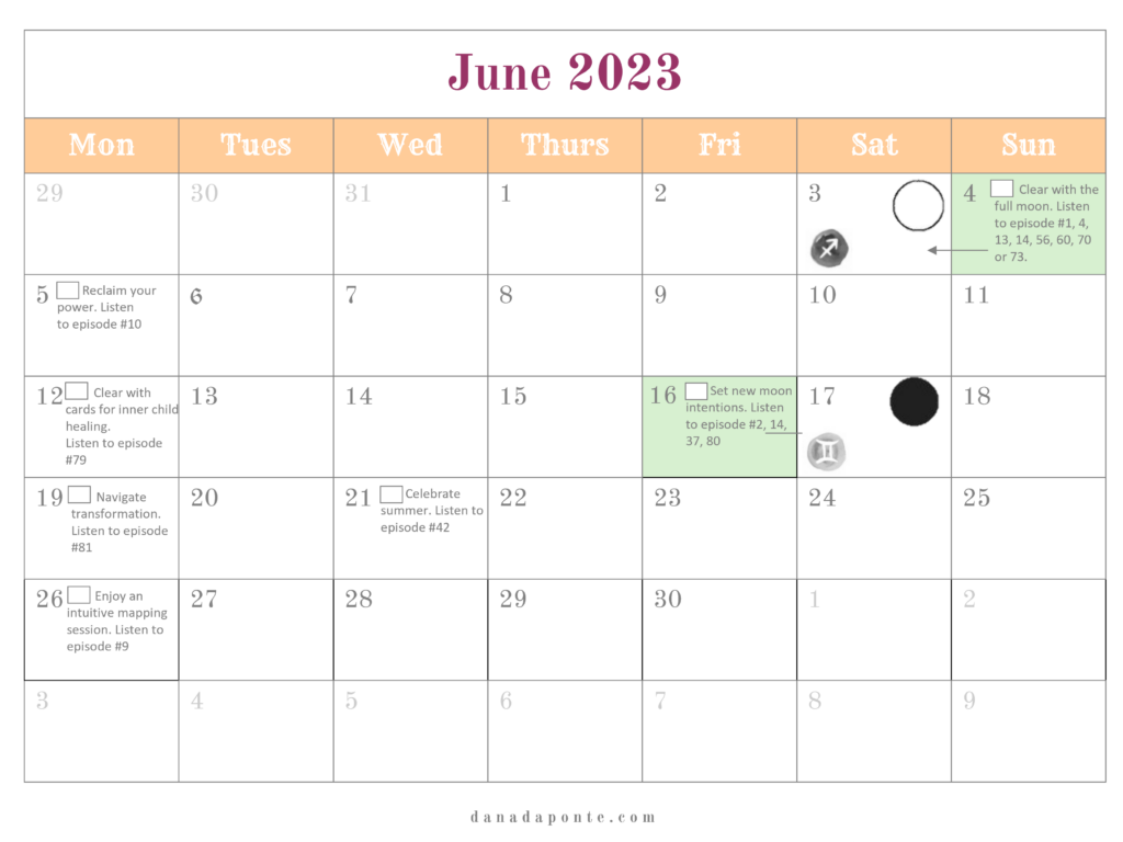 It outlines the new and full moons for the year and if you’re part of the Moon Mapping Year, it also lists the brain rewiring episodes I suggest listening to each week according the lunar and seasonal rhythms.