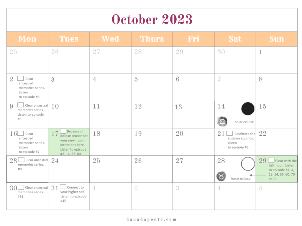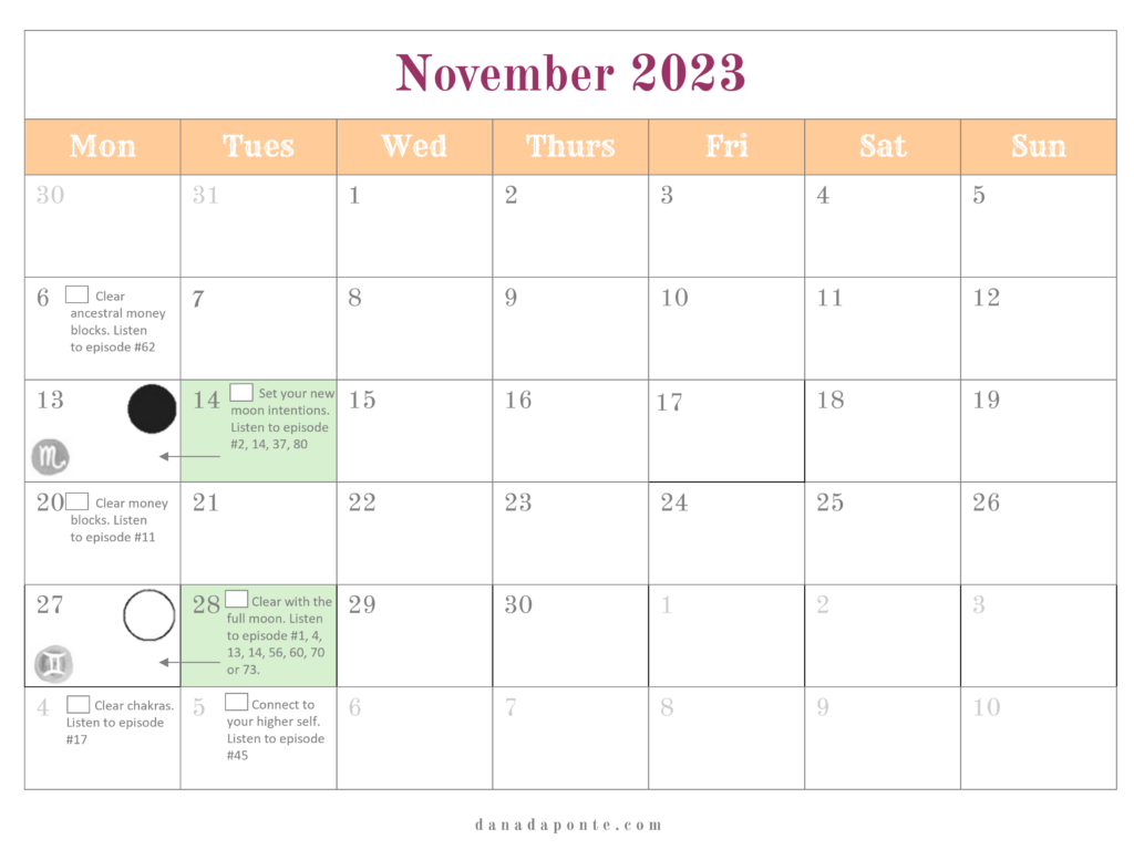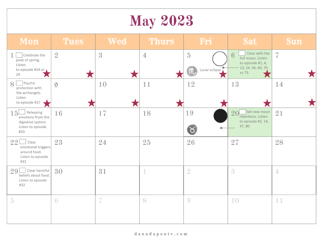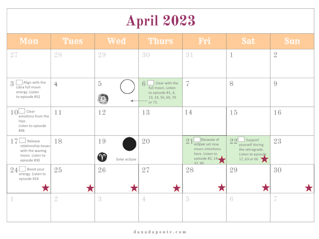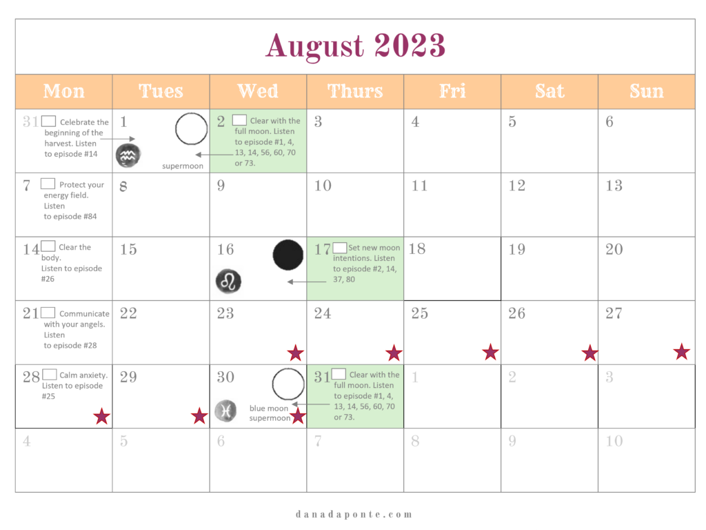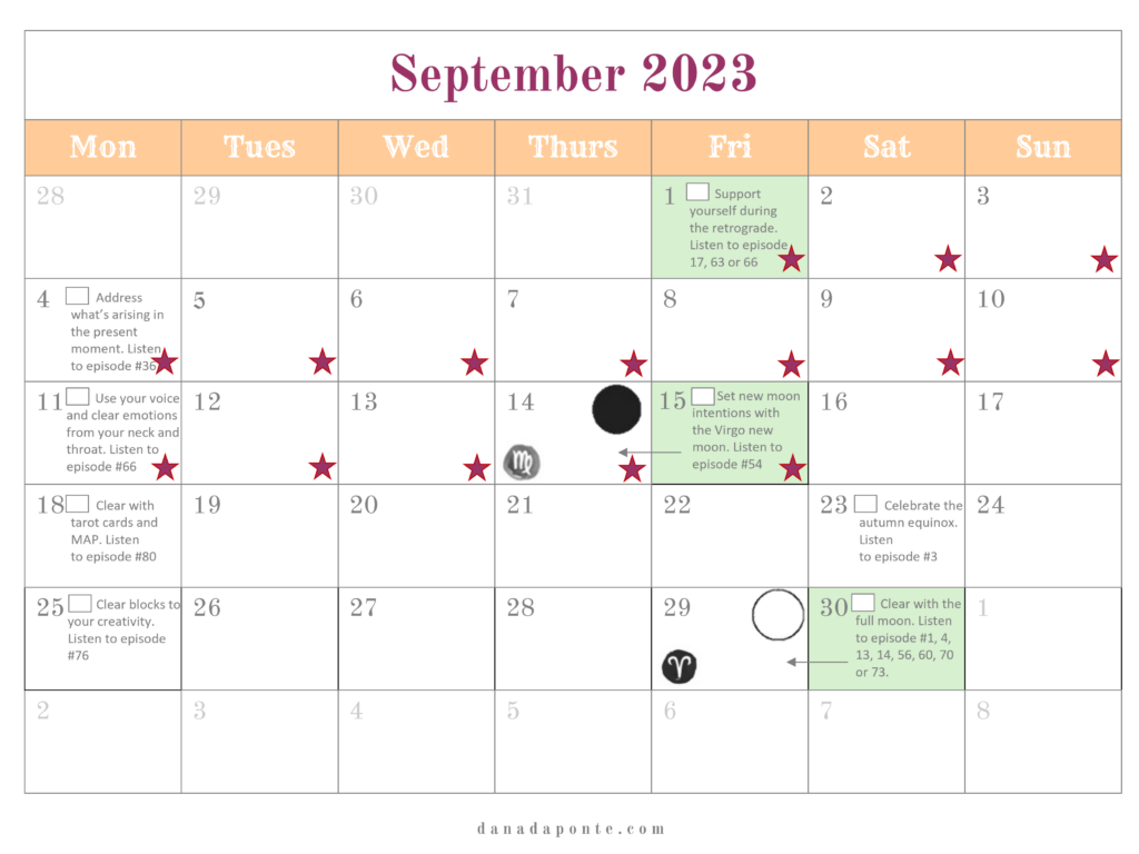 It outlines the new and full moons for the year and if you’re part of the Moon Mapping Year, it also lists the brain rewiring episodes I suggest listening to each week according the lunar and seasonal rhythms.