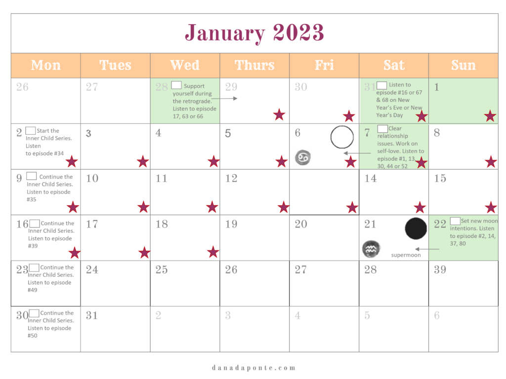 Even if you haven’t joined the Moon Mapping Year yet, you can read my suggestions and get an idea of some of the emotional and spiritual themes you can align with every week in 2023.