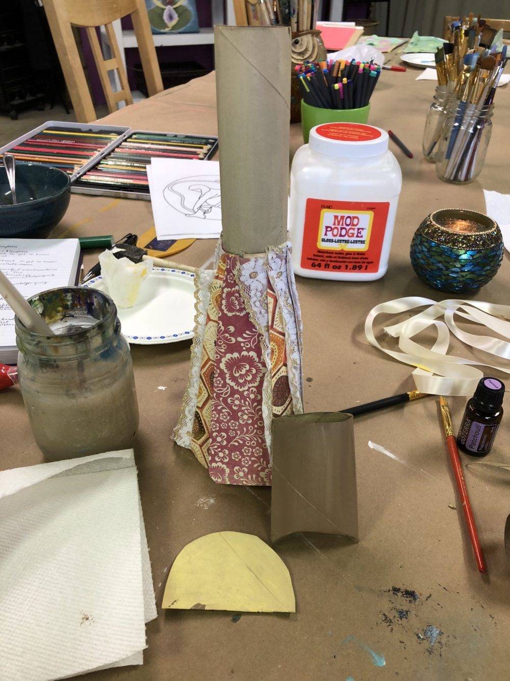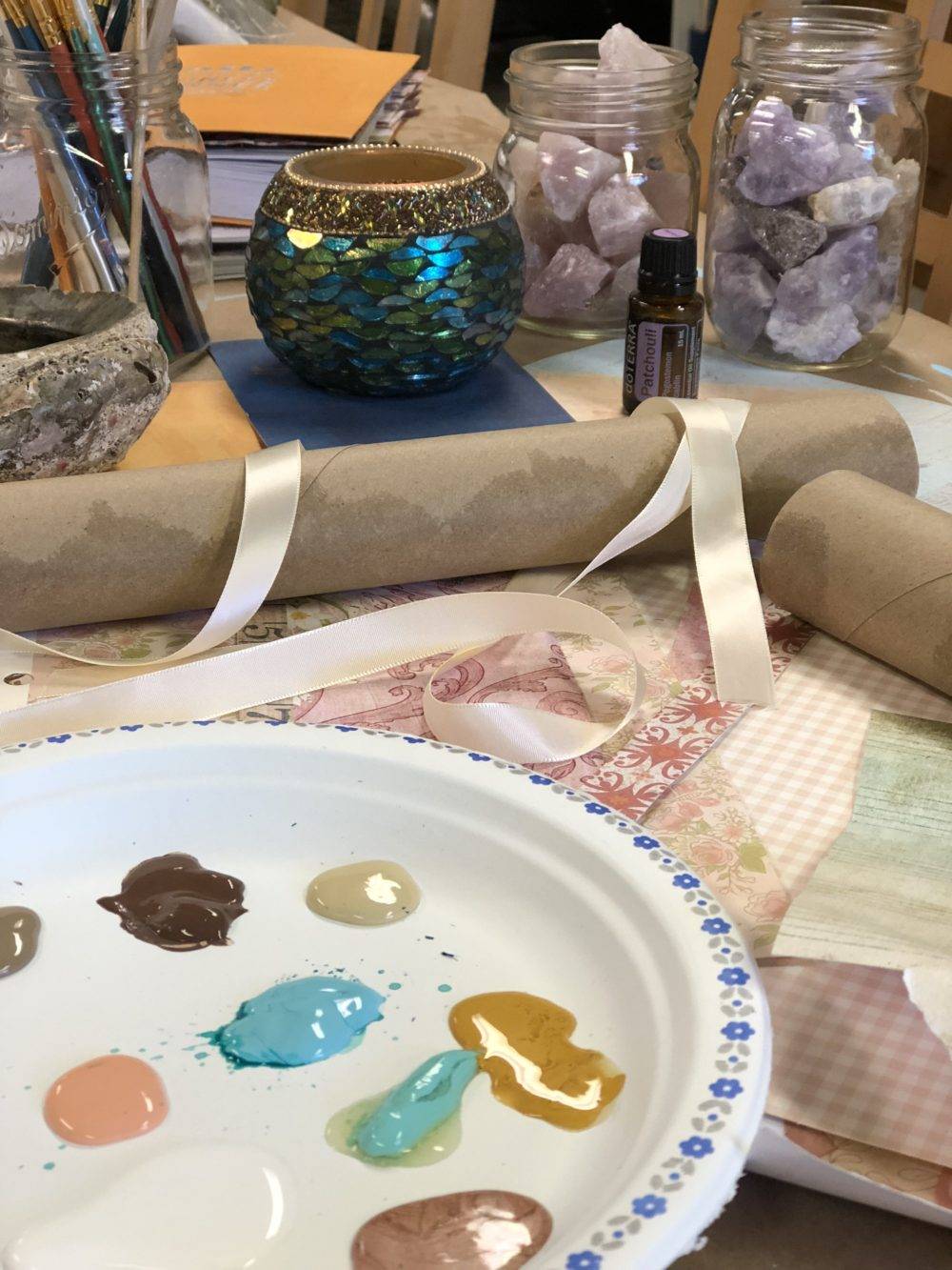 Once my oils were going and I could breathe them in, I moved onto the first step in this art ritual which was to gather the materials. This is a very flexible art ritual. You can make tons of adjustments and use whatever you have on hand but you will definitely need two paper towel rolls. This is what I gathered together and used: