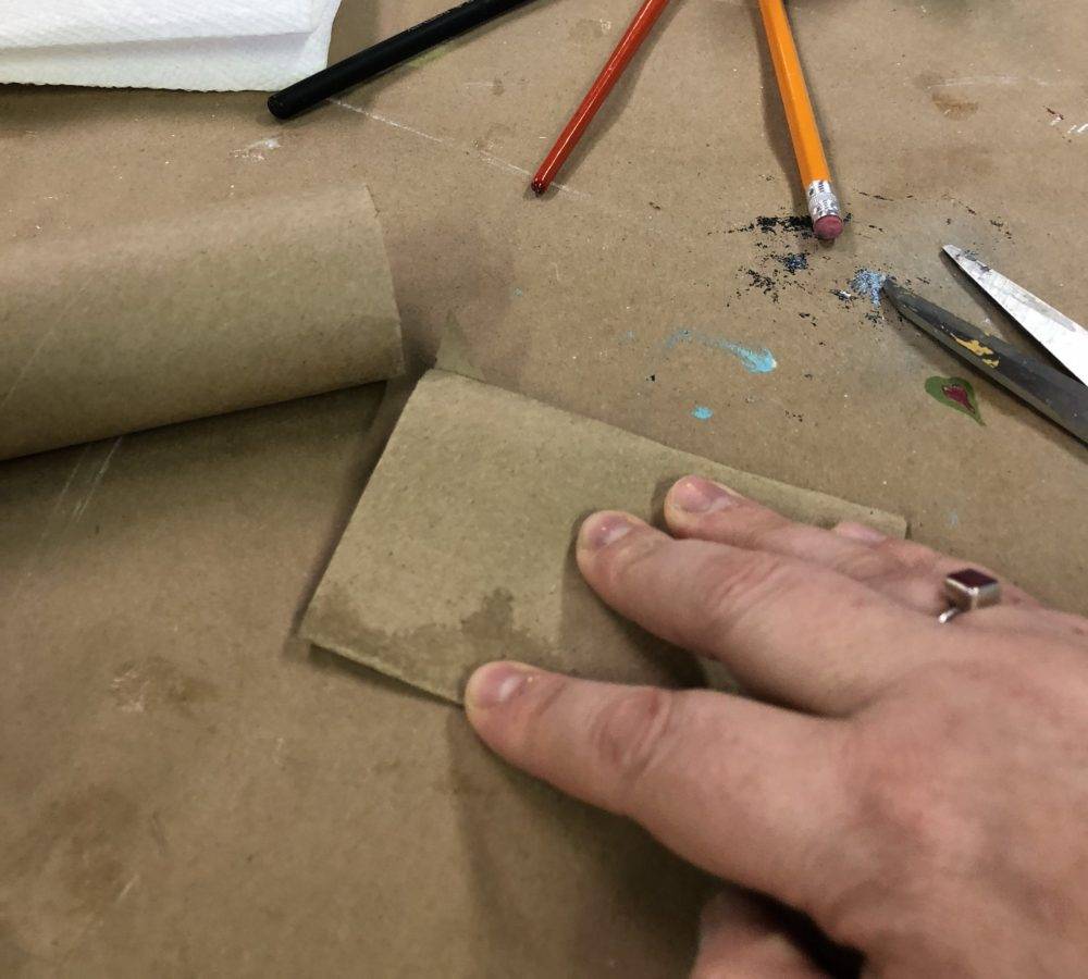 I saved one of my paper towel rolls to paint my self-portrait on. The second paper roll I used to create a small pouch. I cut about a quarter of the paper roll off and squished it down.