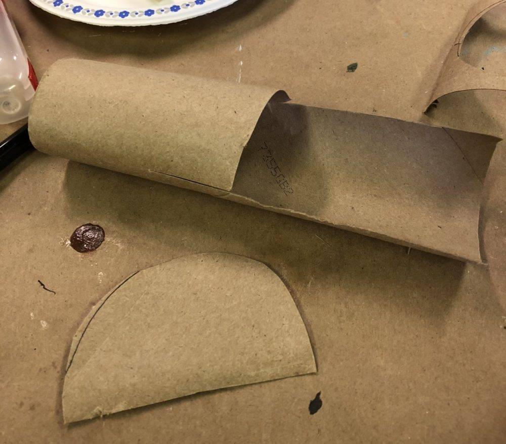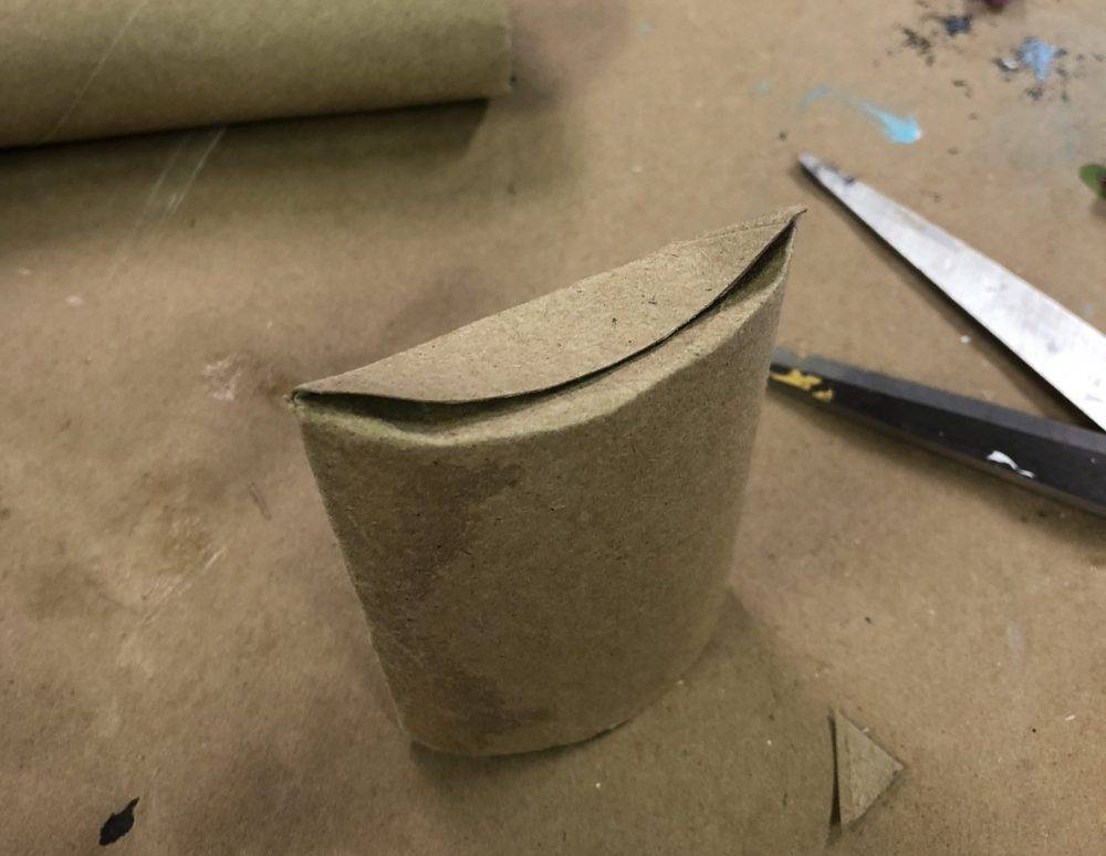 - Take one of the paper towel rolls and cut about a quarter of the paper roll off and squish one end of it down to create the bottom of a pouch.
