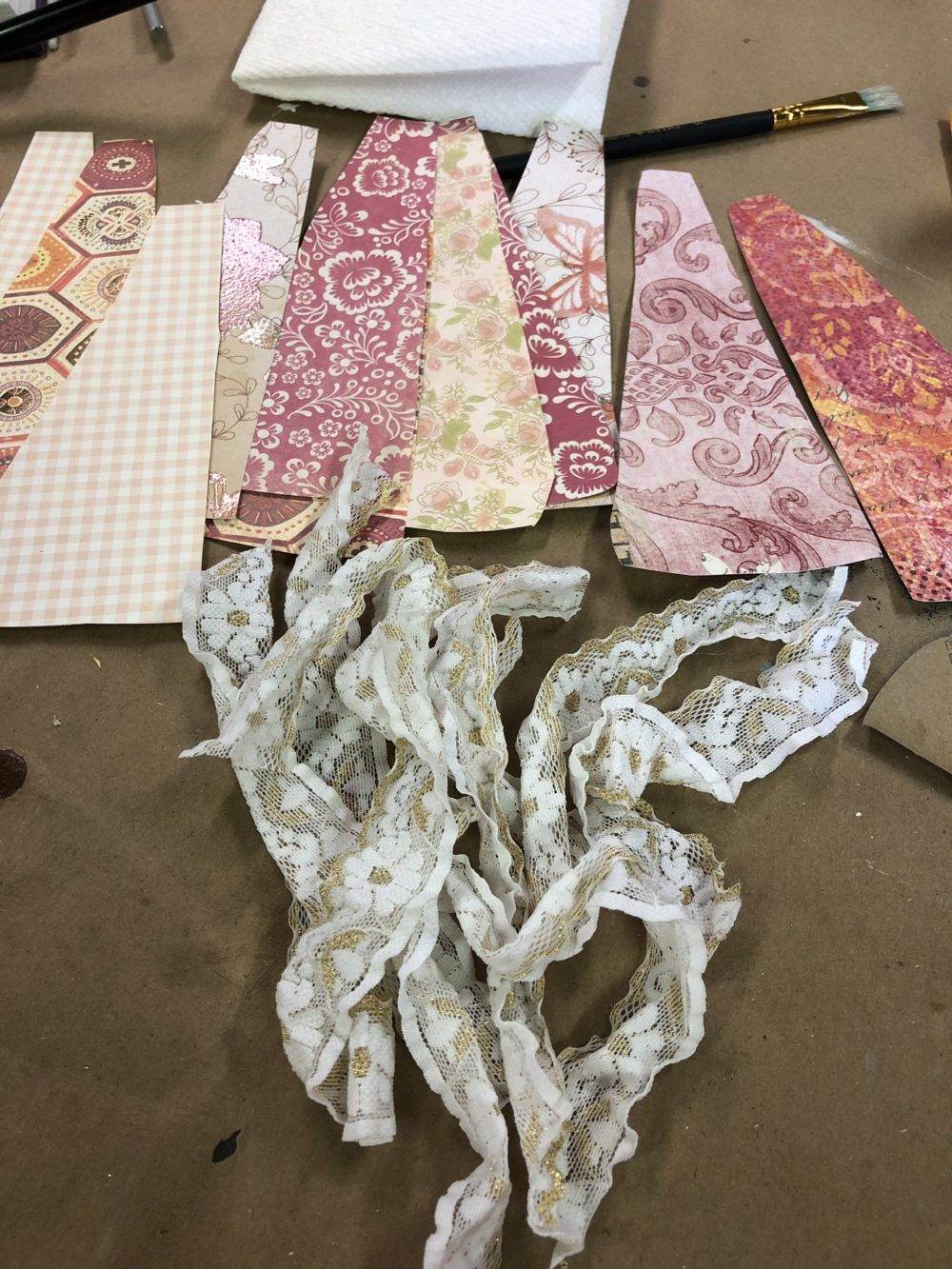 Next, I cut strips of decorative paper to create a skirt around my paper roll. I included strips of lace to glue to one side of each paper strip.