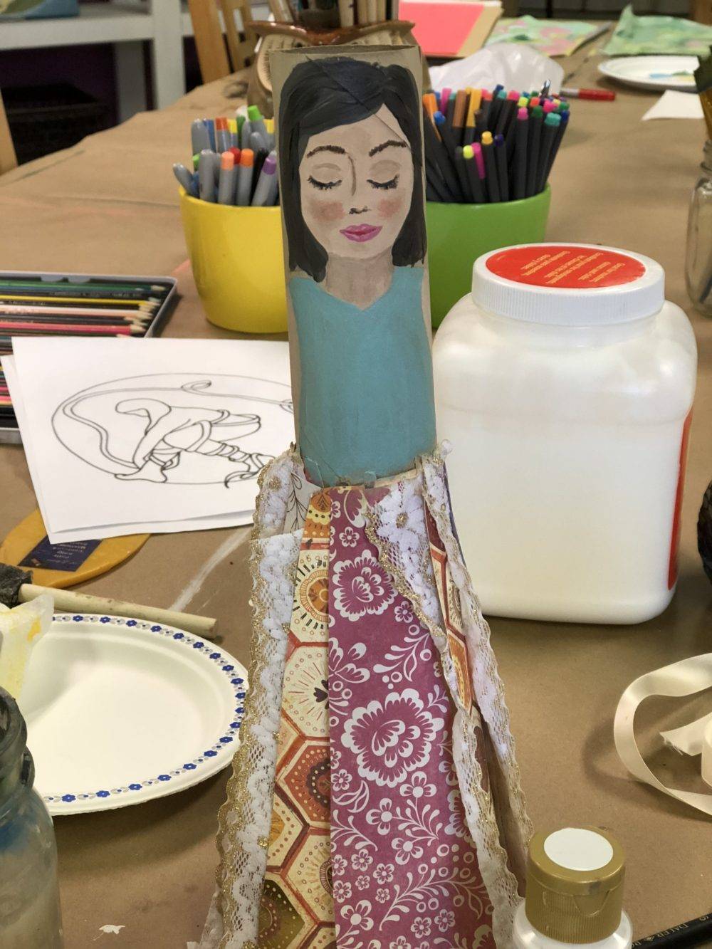 - Glue the end of your ribbon to the waist of your paper roll self-portrait.