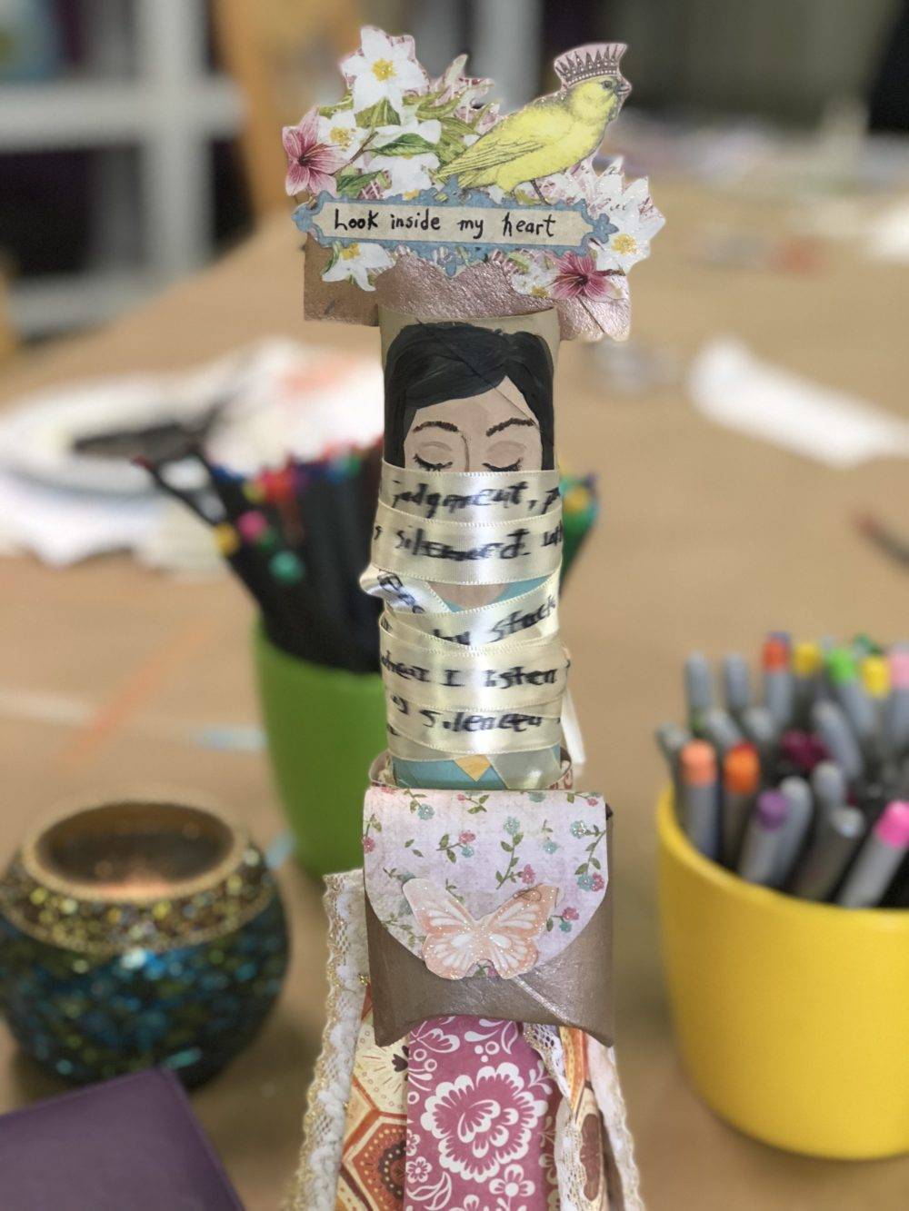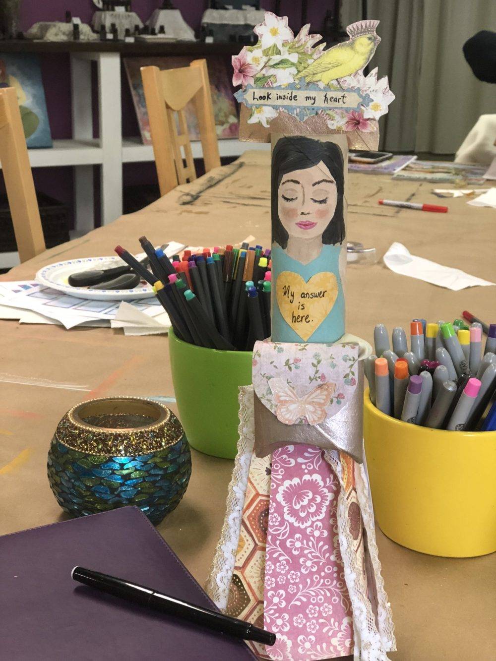Next came the finishing touches. I cut out a bird and flowers image and glued it to my semicircle and cut two small notches at the top of my paper roll to insert the semicircle onto. The I glued the end of my ribbon to the waist of my paper roll self-portrait. To finish the waist off I cut a strip of decorative paper and glued it to the waist to hid the end of the ribbon and the end of all the skirt pieces. It looked like a belt. Then I glued the pouch onto the front of the paper belt. Lastly, I glued a heart onto the front of the shirt and wrote “My answer is here” to remind me the importance of looking within for my answers.