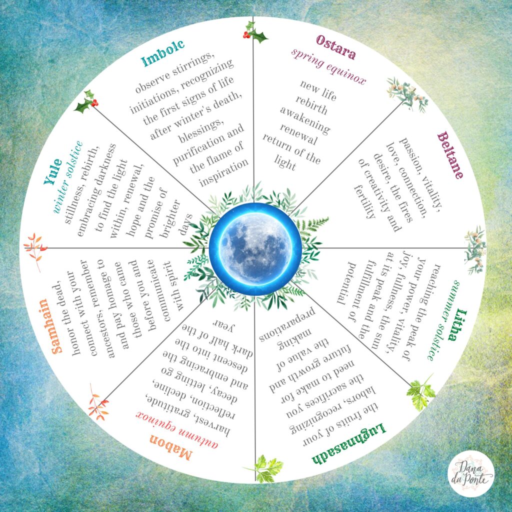 In the northern hemisphere, nature is a perpetual cycle of seasons. Many nature-based spiritual practices use the circle to represent the Wheel of the Year, which encompasses the eight seasonal celebrations. These celebrations mark the Earth’s journey around the sun and the changing seasons, from the rebirth and freshness of spring to the abundance of summer, the harvests of autumn, and the deep introspection of winter. Each phase brings its own energy, its own lessons, and its own magic. In March, when the Earth isn’t tilted toward or away from the Sun, day and night are of equal length. It’s the spring equinox or Ostara where we’re celebrating new life, rebirth, awakening and renewal. In May, at the midpoint between the Spring Equinox and Summer Solstice we celebrate Beltane. Days are longer, the sun is growing in power and it traditionally heralds the peak of spring. It’s a time to celebrate passion, vitality, love, connection, desire, the fires of creativity and fertility. Around June 20th-23rd the Sun is at its northernmost point in the sky, leading to the longest day and shortest night in the Northern Hemisphere. The Earth’s North Pole is tilted closest to the Sun and it’s the Summer Solstice, a time to celebrate reaching the peak of your power, the earth’s abundance, joy, fullness, the sun at its peak and the fulfillment of potential. Around August 1st, Lughnasadh falls between the Summer Solstice and Autumn Equinox and marks the beginning of the harvest season. It’s a time to celebrate all the hard work you do, enjoying the fruits of your labors, recognizing the sacrifices you need to make for future growth and the value of making preparations. Around September 20th-23rd we reach Mabon or the Autumn Equinox, another point where day and night are of equal length. As with Ostara, the Earth is not tilted toward or away from the Sun. It’s a time to celebrate the harvest, gratitude, reflection, decline, decay, letting go and embracing the descent into the dark half of the year. Samhain is celebrated around October 31st to November 1st. It’s the midpoint between the Autumn Equinox and Winter Solstice and is often seen as the start of the winter season. It’s a time to honor the dead, celebrate the thinning of the veil, connect with your ancestors, remember and pay homage to those who came before you and communicate with the spirit world.