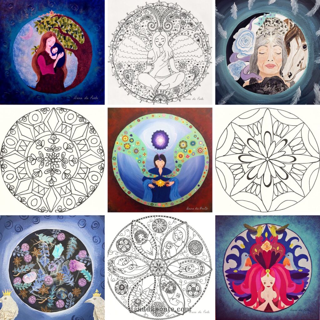 One of my favorite ways to work with the sacred symbolism of the circle is to create mandalas. As Susanne F. Fincher describes in her book, Creating Mandalas, mandala is a Sanskrit word meaning center, circumference or magic circle.  Mandalas have been a spiritual symbol and an artistic motif for centuries, revered for their representation of unity, wholeness, and the infinite. At the heart of a mandala is the idea of the center, an axis upon which the world turns, reflecting the universe and our place within it. In many spiritual practices, mandalas serve as sacred spaces that capture divine energies and facilitate meditation, drawing the observer into a realm of introspection and connection with the Divine. From a psychological perspective, Carl Jung, a Swiss psychiatrist and psychoanalyst, introduced the West to mandalas as a means to bridge the conscious and unconscious realms. Jung posited that creating mandalas allowed individuals to externalize their subconscious thoughts and feelings, making them tangible and thus more accessible for introspection. The very act of drawing or coloring a mandala can be therapeutic, grounding, and centering, especially during times of chaos or emotional upheaval. They act as mirrors, reflecting back the intricacies of one’s inner world and aiding in the process of self-discovery and healing. This is how I like to use them.
